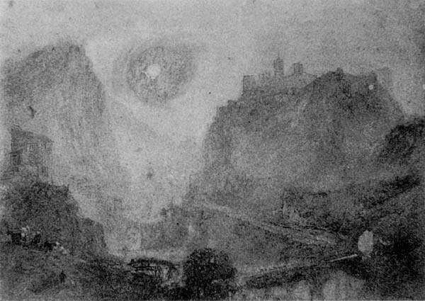 So at the very least we can say that the watercolours must have been begun on site. The detail is so specific and the topography so consistent that they could not have been done from memory. It may be, of course, that the watercolours were simply begun on the spot in pencil. The general feeling amongst recent scholars has been that Turner began such studies in pencil and then applied colour later, possibly in his hotel room, or even in the studio after his return to England. In the case of the present watercolour, however, there is something sufficiently specific about the effect as to bring that into question; a phenomenon so exceptionally particular that it must have been recorded under the direct impress of experience.