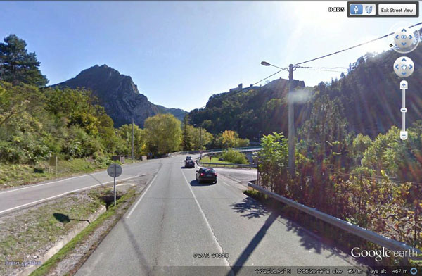 Turner’s viewpoint is from the north-west, just beyond the Pont du Buech, looking over the bridge with the Rocher de la Baume on the left and the citadel of Sisteron on the right. I have marked the exact viewpoint in Google Earth, and Google’s ‘Street View’ can put you more-or less on the very spot:-