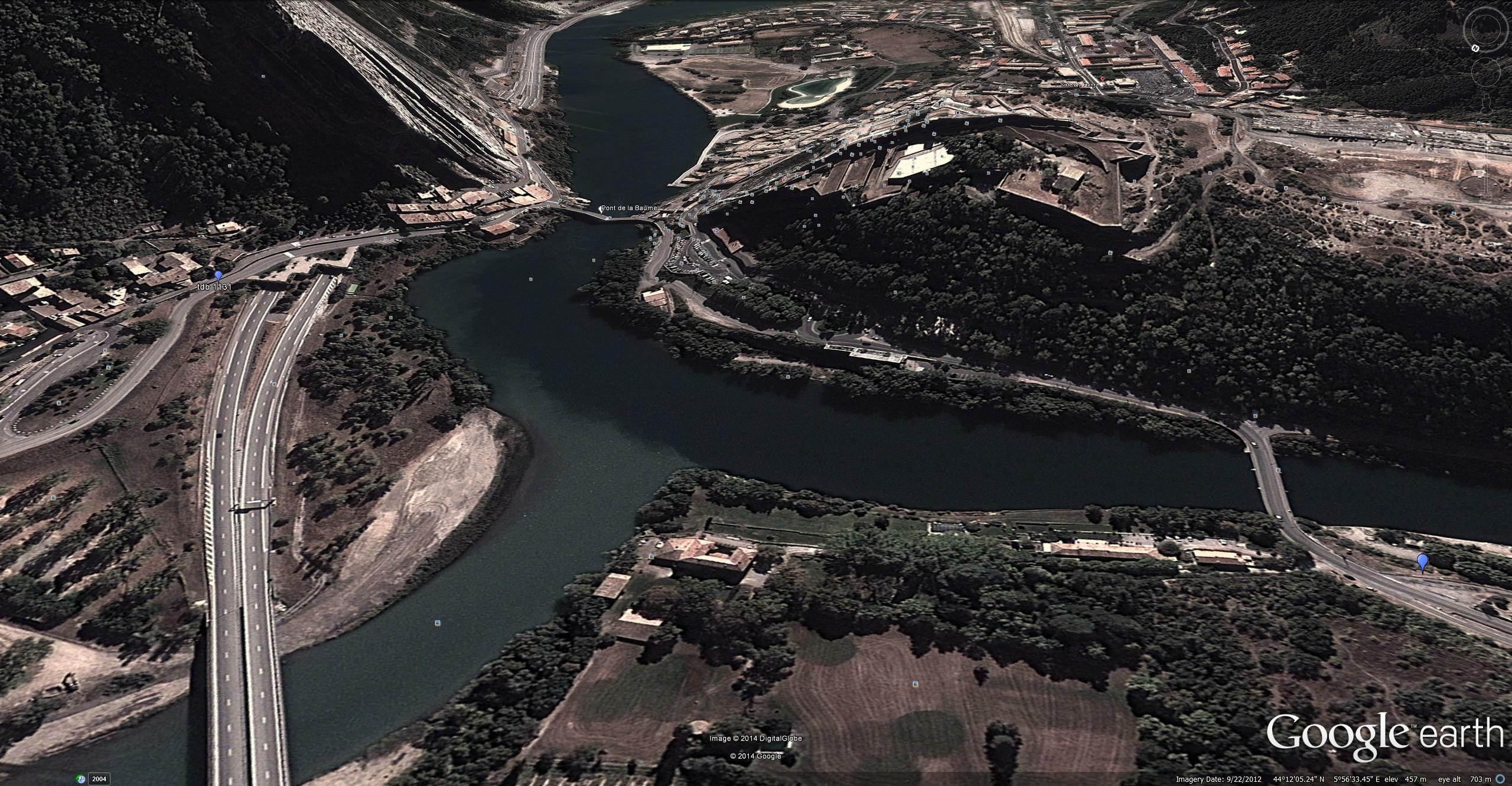 In fact this is impossible. As can be seen from the Google Earth image the Pont de la Baume is not visible from anywhere near the Pont du Buech. It is hidden round the right-angled corner where the Buech joins the Durance.