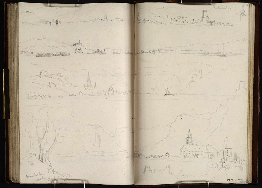 Page spread with a group of sketches made from a boat on 27 August 1817 when travelling by boat down the Rhine from Mainz to St Goar, including