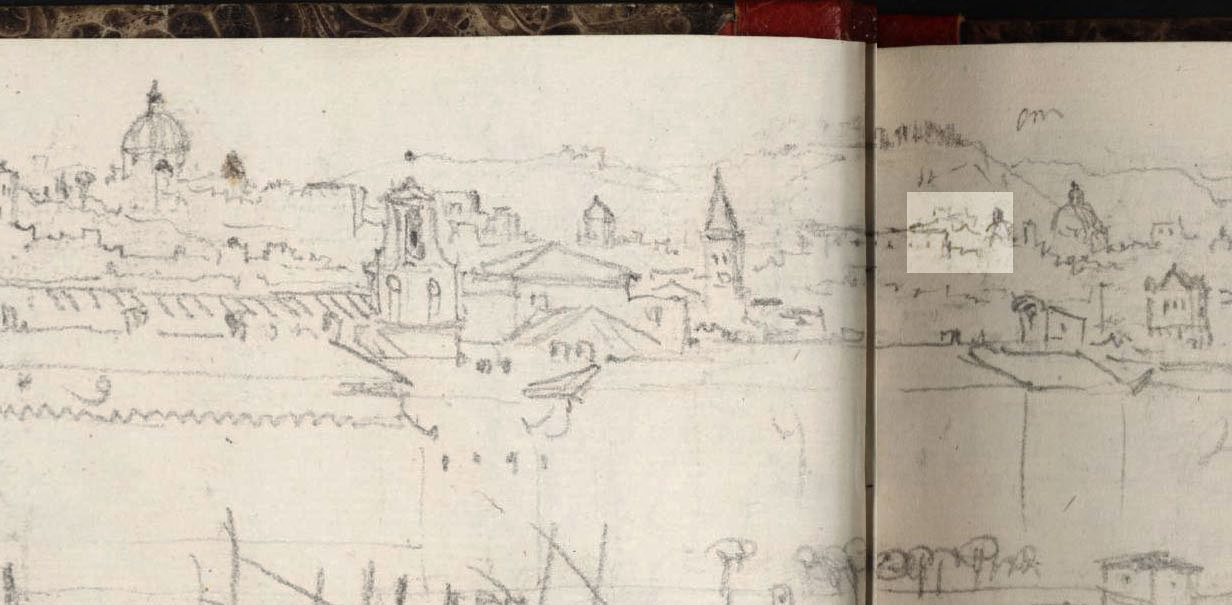 Turner made hundreds of sketches in Rome in 1819, and one strong impression given by the sketchbooks of that year is how systematically he walked around the city looking for panoramas. He seems to have taken in the Aventine at least twice.