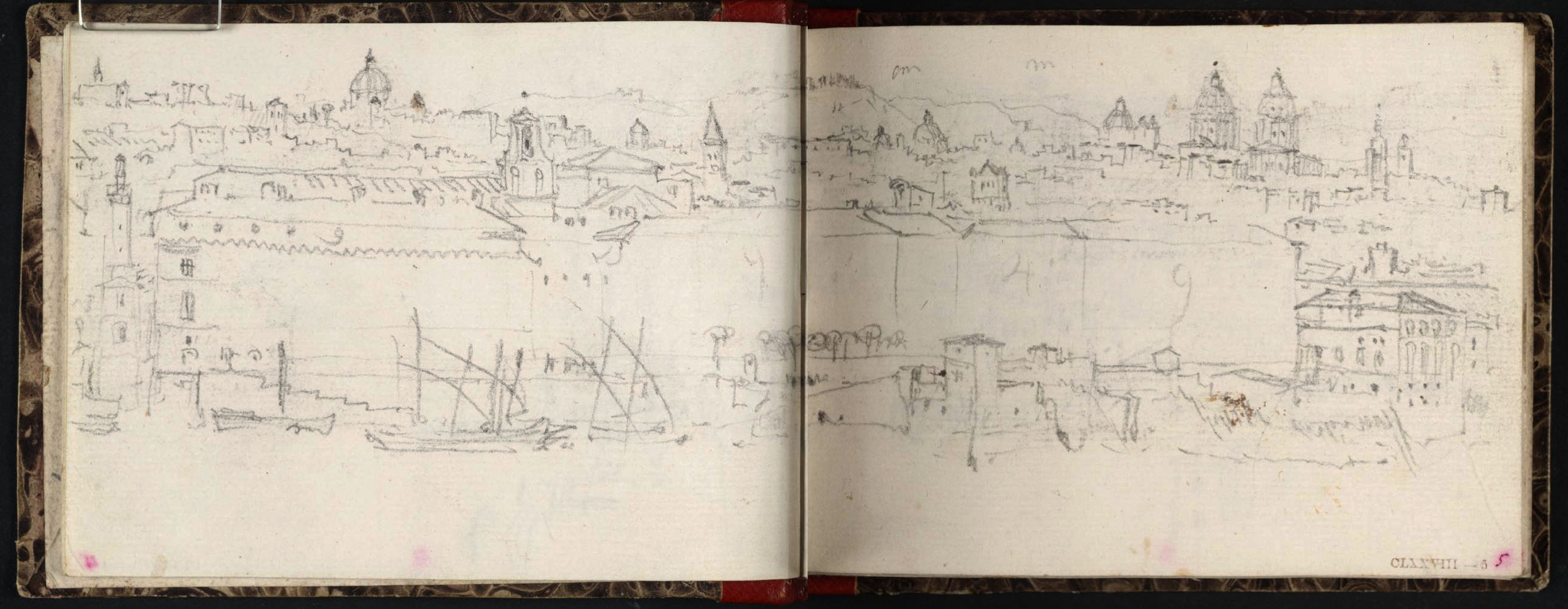 Yet another group of sketches in the area can be found in the St Peter’s sketchbook (TB CLXXXVIII). This includes a repeat sketch of the Isolo Tiberina (51), two careful sketches of the Ponte Rotto (52, 52a), a careful study looking up to the cliff-top churches of the Aventine from the right bank of the Tiber (56) and a series of sketches again exploring the distant view of the city from the south (54a et seq). Click on any image below to open a gallery of drawings from the St Peter’s sketchbook (TB CLXXXVIII):
