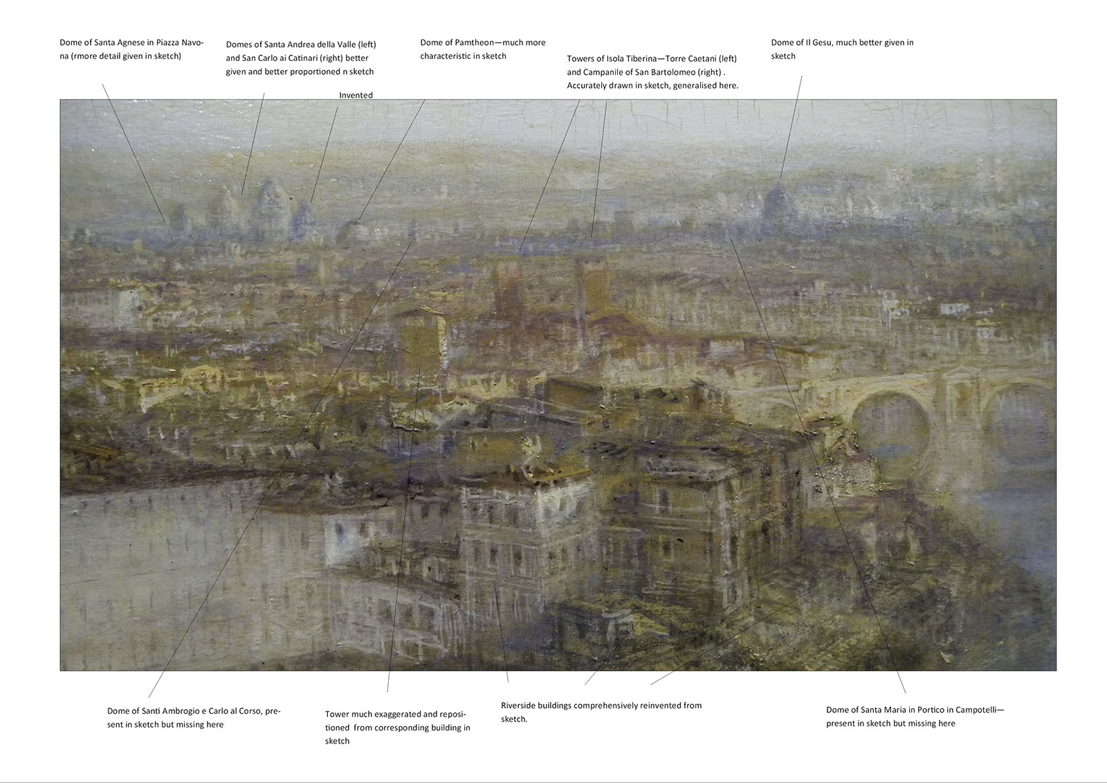Nowhere else in the painting, however, is the detail superior to that of the sketch. This is particularly true of the cluster of Domes in the left middle distance that includes those of Sant Andrea della Valle ad San Carlo ai Catinari, and the Pantheon, all mere ciphers of themselves, and at least one of the domes – that to the left of San Carlo – altogether invented. This is especially striking in the case of Sant Andre and San Carlo where, as we have already noted apropos of the sketch, Turner took some trouble over the appearance of the domes.