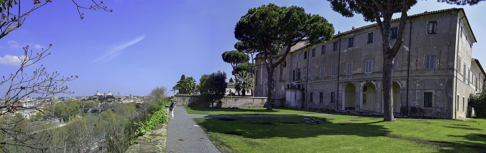 Getting onto the terrace of Sant Alessio was somewhat like threading the Labyrinth. First I joined the British School in Rome [no bad thing, at all!] in order to take advantage of their permissions negotiation service. This secured a letter of invitation from the director of the Instituto. Finding the entrance to the Instituto requires initiation. Having presented myself at the gate to Sant Alessio church I discovered that this was reserved for the Padre Somachi who minister there. I was directed to an inconspicuous gate in a wall down the street. Inside the gate a concierge at a subterranean window demanded to know my business. With my letter I was admitted to a courtyard, where another door gave entrance to the cloister. Another challenge, another explanation and directions to the office of the director. A grand staircase, massive wooden doors, an office door ajar and a warm welcome. Directions back the cloister, an oasis of light and calm, two more massive doors, and then out under the portico and umbrella pines, to dewy grass (take care for the re-seeded patches) and morning sunlight opening the entire panorama of the city. So much, so privileged, and two hours completely undisturbed. Afterwards exiting to the street, where a hundred yards to the right a hundred and fifty tourists In the Piazza dei Cavalieri di Malta queued in line to take turns to squint through a keyhole in the gate, to catch a glimpse of St Peter’s between some trees.