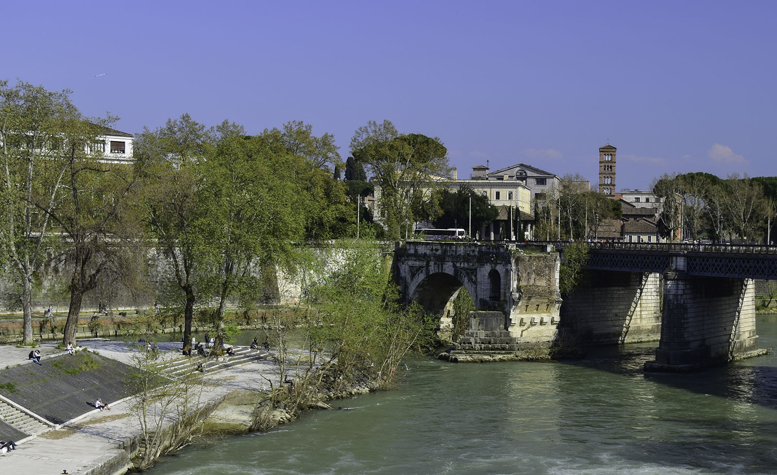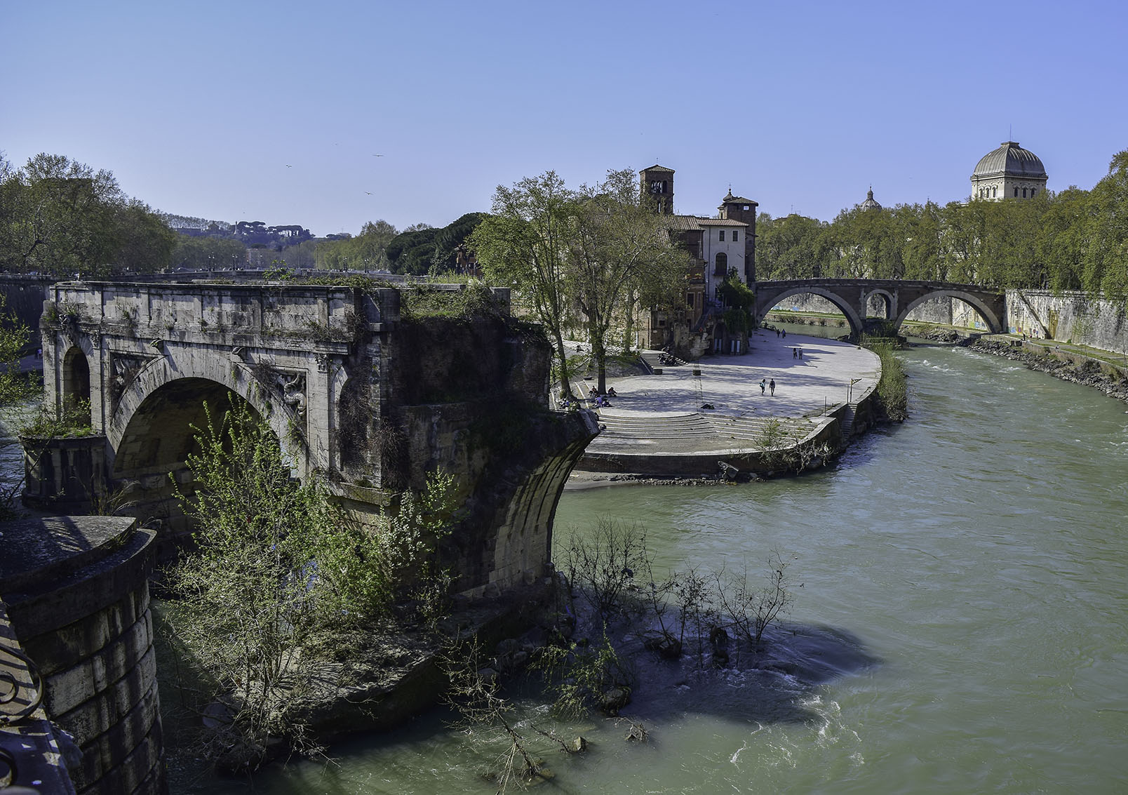 The bridge in the middle distance is the Ponte Rotto or Ponte Emilio as it was properly named. This was an originally Roman bridge of seven arches built in the 2nd C BC. It was periodically damaged by floods and rebuilt especially in 1230 and 1557, until in 1575 and 1598 the whole eastern half was washed away, and it was given up as a lost cause. After that two main arches and a slightly smaller arch abutting the bank stood uselessly – known by the colloquial name ‘Ponte Rotto’ – until 1853 when the gap was respanned with an iron footbridge. That lasted only a few years until 1887, when the whole bridge was condemned and demolished all but one arch. The remaining arch survives, curiously marooned in mid-river, and a new bridge, the Ponte Palatine has been built immediately downstream.