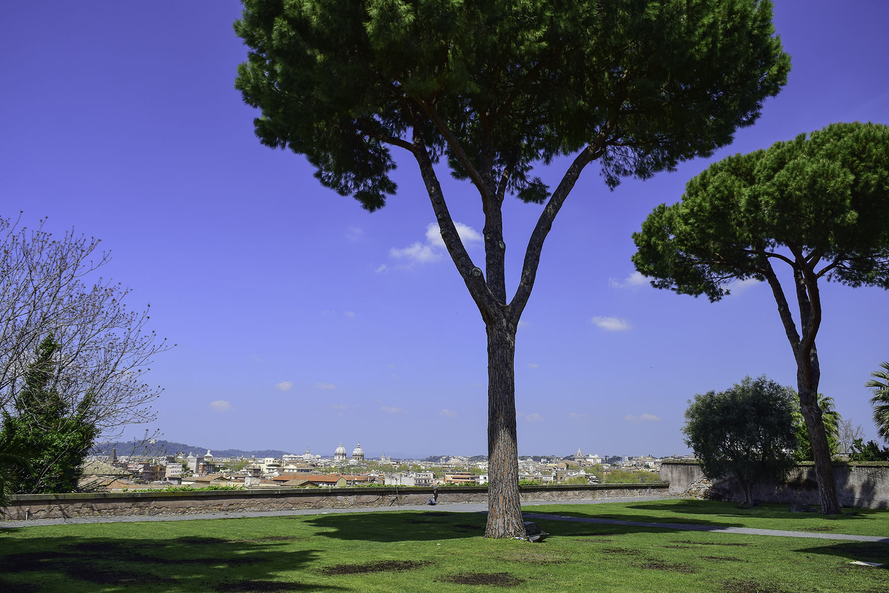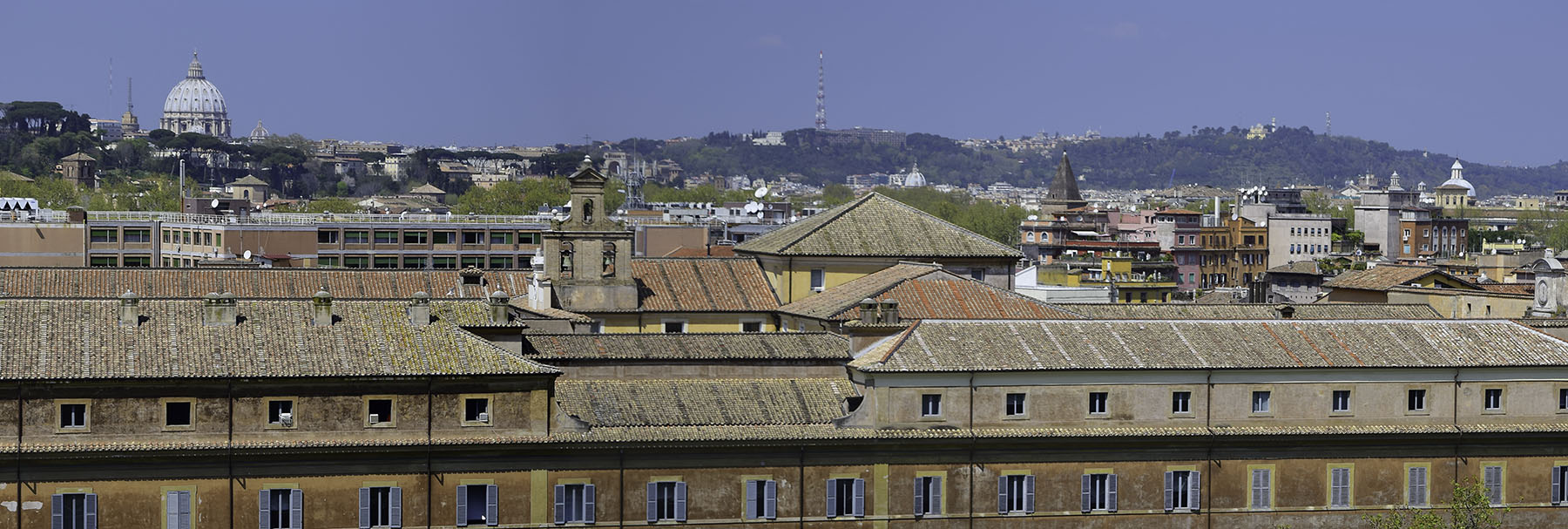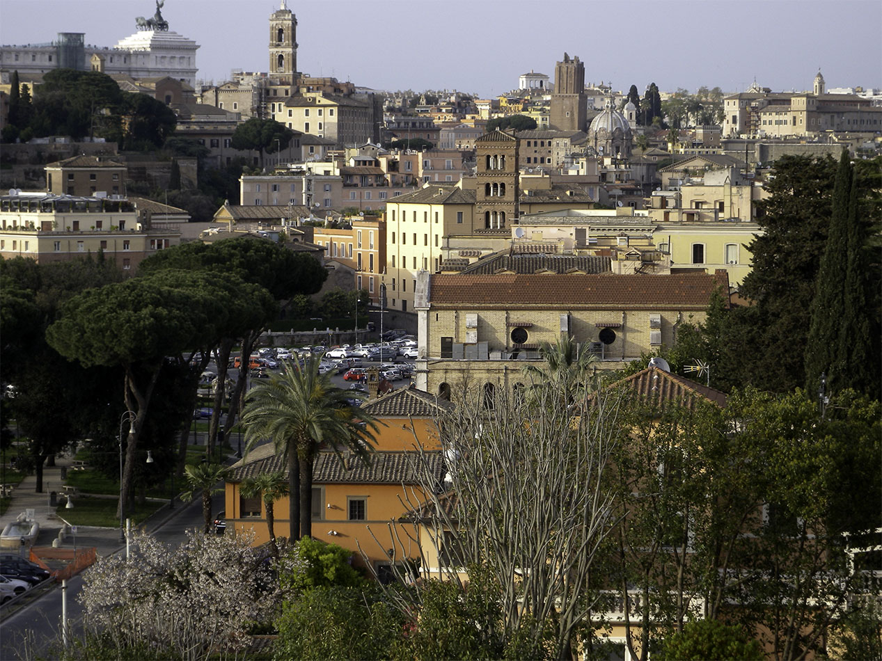 Mount Aventine is the southernmost of Rome’s seven hills, with low cliffs looking over the Tiber on its western flank where terraces give onto a panorama that stretches from Trastevere and St Peter’s, over the river and Ponte Rotto to the old city crowded with domes and campaniles, and on to the Capitoline Hill and Forum. It is perhaps surprising that Sotheby’s did not offer us a photograph of the view as it is today. Thanks to the sponsorship of the Pilkington Anglo-Japanese Cultural Foundation I was able to make the trip to Rome in April 2015 and to follow exactly in Turner’s Aventino footsteps. The British School in Rome negotiated access for me to the terrace of the Instituto Nazionale di Studi Romani and permission to photograph the view as it is today.