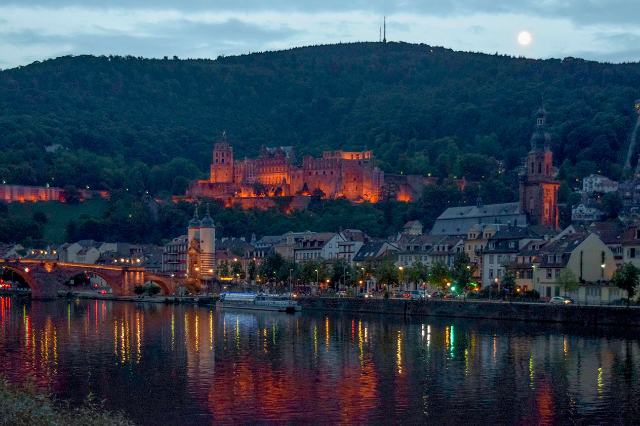 So there is a case for caution, but what convinces me that they are indeed of Heidelberg is how faithful they are to the phenomenal character of the site. The really distinctive feature of Heidelberg from this aspect is the way in which the sun sets on the castle. As the light lifts from the river so it intensifies to a brilliant gold, and then red, playing over the purple-red sandstone of the buildings. Turner gives this in perfect succession: First in the private collection watercolour, with the light cool over the river, and slanting onto the tower of the church, castle and wooded slopes beyond; second, in the Fitzwilliam watercolour a few minutes later, with the light still more intense on the church and castle, but the light below sufficiently faded to allow the lights on the riverside to put forth; finally, in night falling. I had not anticipated this when planning my trip in August, but as it turned out there was one spectacular benefit in being there at the same time at Turner. With my camera on its tripod through the three-quarters of an hour that it took for the sun to set and grow dark, the moon suddenly popped out from behind the hill at the back of the town and stood directly above the Heiliggeistkirche, exactly as Turner shows in his final watercolour. I might well be admitting to terminal geekiness but this was genuinely thrilling, and convinced me that I was on the right spot!
