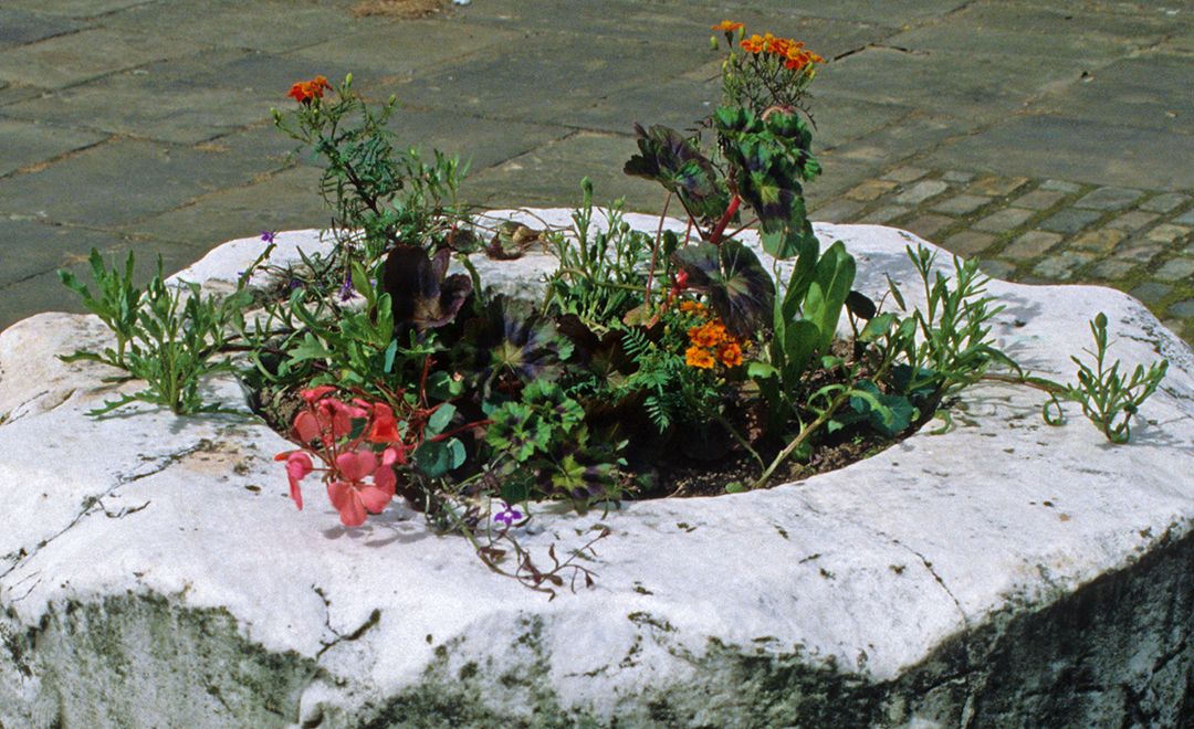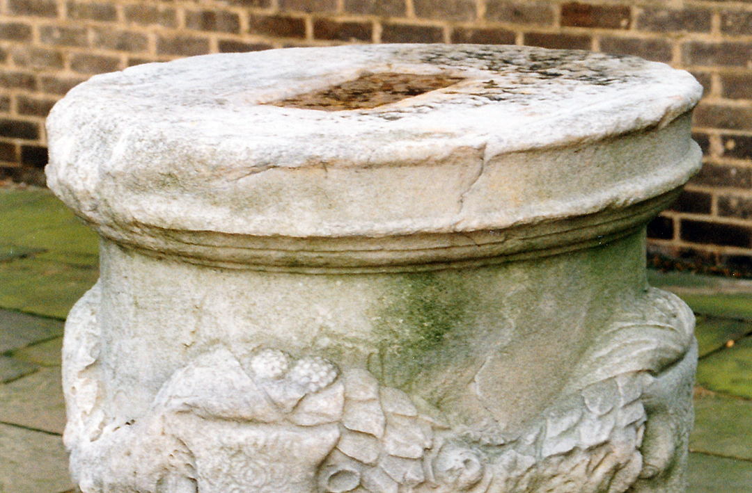 The Corinth Puteal at Bretton Hall Summer service as a plant pot. Photograph by David Hill, taken summer 1993.