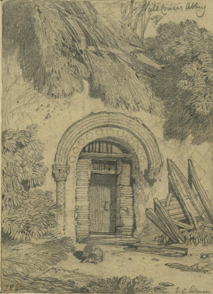 There is, however, a pencil and grey wash watercolour, signed and dated 1803 that was at one time with Spink’s in London and later sold at Tennants auctioneers of Leyburn, Yorkshire, on 2 April 2009, as lot 658, ‘Valle Crucis Abbey, Denbighshire – a Doorway’, est £400-600 and bought for £3800 by a London dealer.