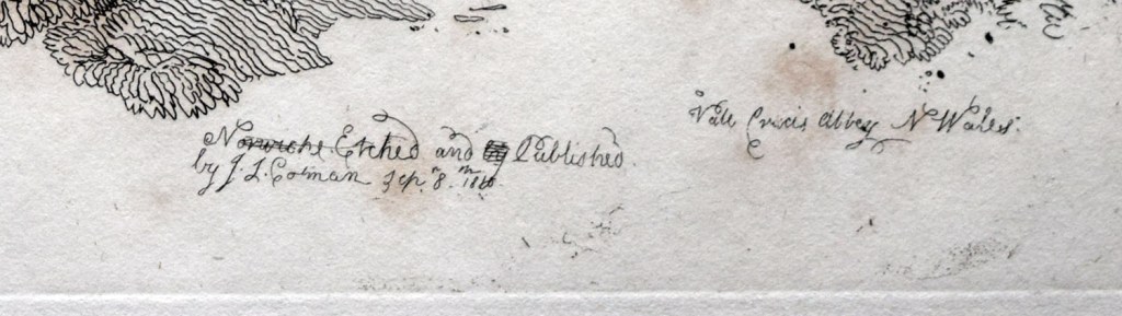 Inscribed lower right, on plate bottom right of subject ‘Vale Crucis Abbey N Wales’; on plate bottom left centre of subject ‘Norwich Etched and by [deleted] Published/ by J. S. Cotman Sepr 8th 1810’. Plates from the collected 1811 edition of the etchings are inscribed in graphite by the artist ‘Val Crucis Abbey, Denbys’ as called for in the printed list of subjects.