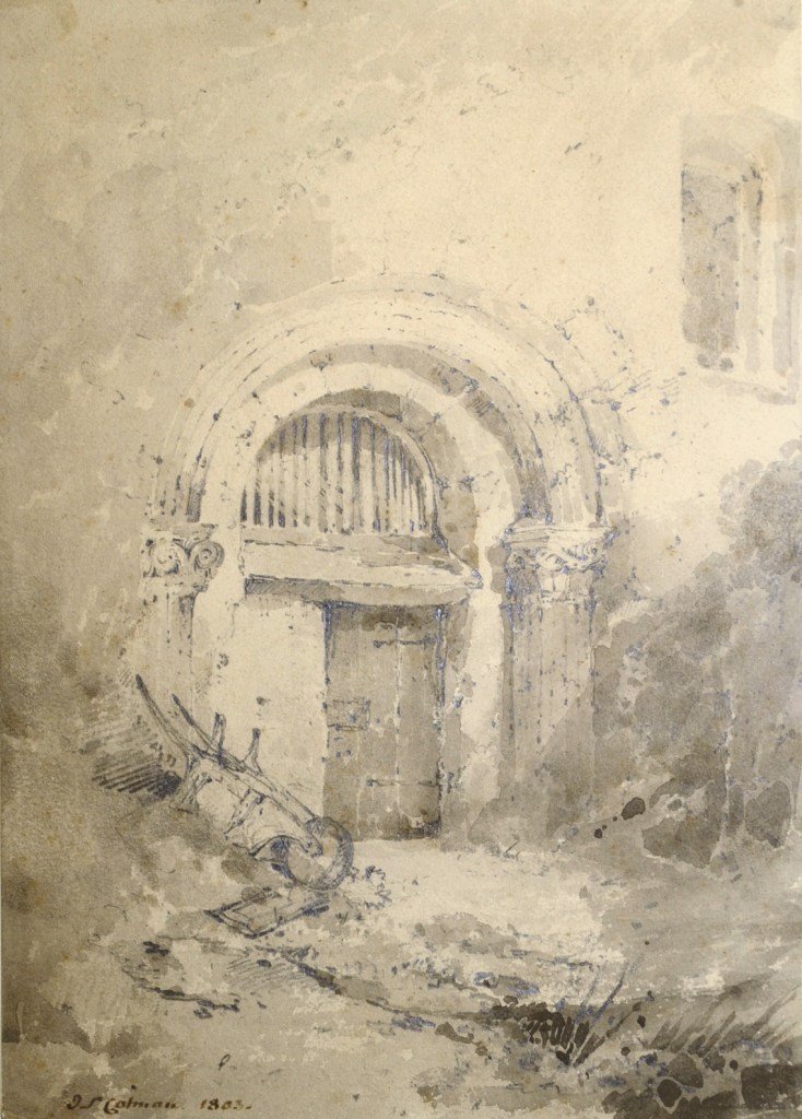 I am interested to know your thoughts on the soft-ground etching titled by Popham ‘Part of a Cottage with a Water Butt & Steps’, initialed JSC and dated 1801, taken by some to be a mistake for 1810; a copy (BM) also bears a note suggesting Cotman is ‘about leaving Norwich’. A drawing the etching derives from is definitely early, sold at Keys in 2012. I assume you know the work – any ideas? A similar subject is ‘A pump, Cottage – Dorking – Surry – JS Cotman 1802’ in the V&A. One or two minor comments : Might I just say that in discussing the Valle Crucis image, you state the work to be inscribed in graphite ‘by the artist’ (?) ‘Val Crucis Denbys’, which I read as ‘Val Crusis Denbys’ – or is it that my Covid eyes deceive me? I have to say that I find the perspective of the doorway arch very odd….The Royal Commission website COFLEIN has some nice old photograbhs of the abbey which show the doorway more akin to Cotman’s rendering (the different capital decorations, the inset doorway structure, etc).