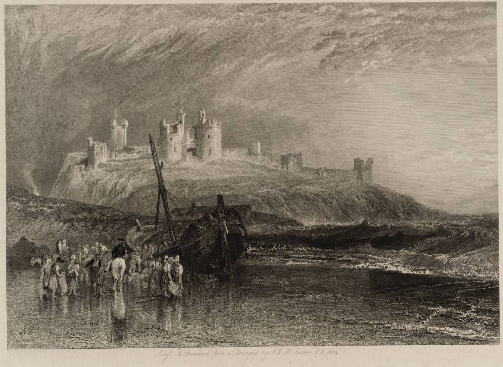 Armstrong 1902, p250 as “Dunstanborough”. Circa 1828. [W A Watson-Armstrong, Esq., ex Lord Armstrong. Ex Heugh (R.A. 1873), Novar and Birchall (M 1857) Collections. Chr. 1867, Munro; 1874, Heugh. Moon’s Gallery, 1833 (T Tomkinson).] 11 x 16 1/2. Wrecked fishing-boat on sand by breaking waves. Man on white horse and crowd of women. Castle on hill in morning light occupies mid-distance. Engraved by R Brandard, 1830, “England and Wales” Mr H H Worthington has a drawing of Dunstanburgh, 17 1/2 x 24;
