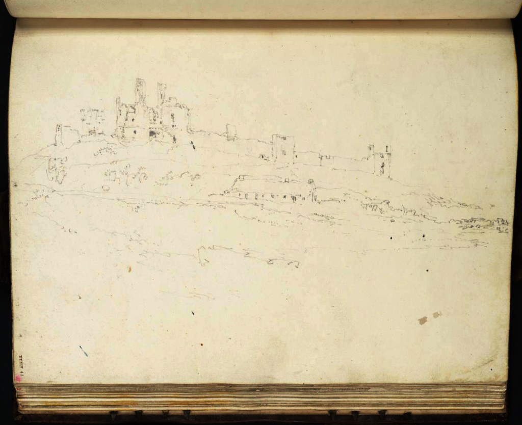 There is, in addition a series of studies and finished works, which all show a similar aspect, but as seen from a nearer viewpoint to the castle, and further right, from where the Lilburn Tower (the taller tower to the left seen in the present composition) is now seen to the right of the gatehouse, and a fisherman’s cottage has been brought into view in the left foreground. The original sketch for this appears lost but there are monochrome and colour studies of this view (Tate D01113 and D00890; Turner Bequest XXXVI S and XXXIII S). These paved the way for a major oil painting exhibited at the Royal Academy in 1798, no.322, at the National Gallery of Victoria, Melbourne, Australia, a slightly later watercolour of c.1802, at Wallington Hall, Northumberland (National Trust) and a sepia watercolour composition (Tate D08118, Turner Bequest CXVI Q), which provided the basis of a mezzotint published in the series of Turner’s Liber Studiorum on 10 June 1808.