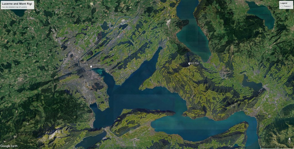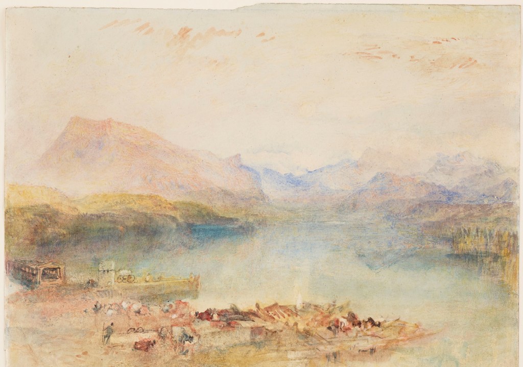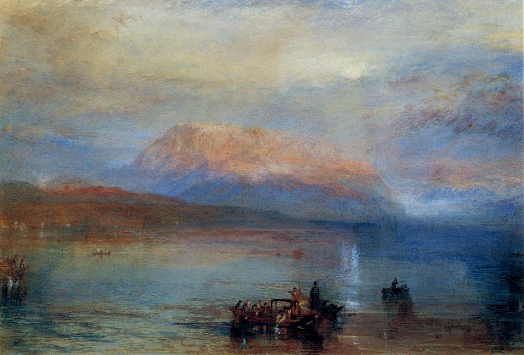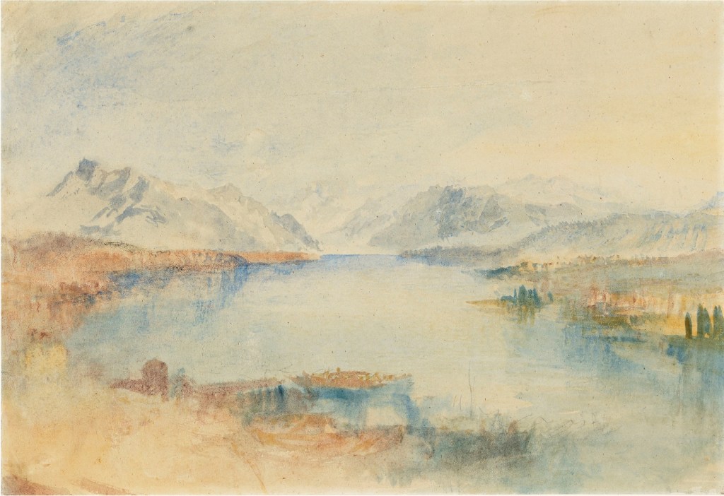 Nor, indeed, is it altogether clear that the effect depicted here is actually that of evening. Although the treatment of the Rigi is much more schematic than in the Christie’s 2019 sketch, the angle of light is not dissimilar. There, it is in the SW about 3 o’clock in the afternoon. Here it is perhaps a little later, but not so late as sunset. From this viewpoint, the Rigi stands almost due east. For the sun to cast an evening red glow on the Rigi, it would have to be near the horizon, that is in the west or even slightly north of west, which is behind us or even over our left shoulder; certainly not from the right as is intimated by the shadows along the north-east-facing crest of the Rigi.