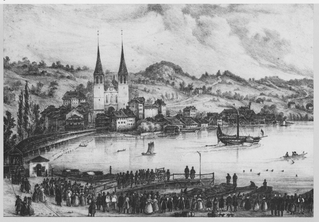In the foreground is the Schwanenplatzquai. In the left middle distance is the new steamboat pier built in 1837 to facilitate the landing of the Stadt Lucerne, the first steamboat on Lake Lucerne.