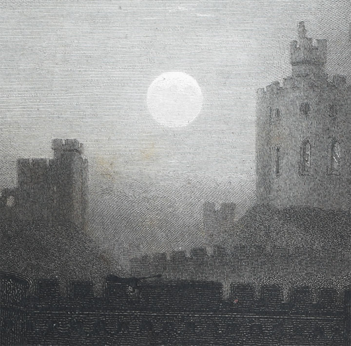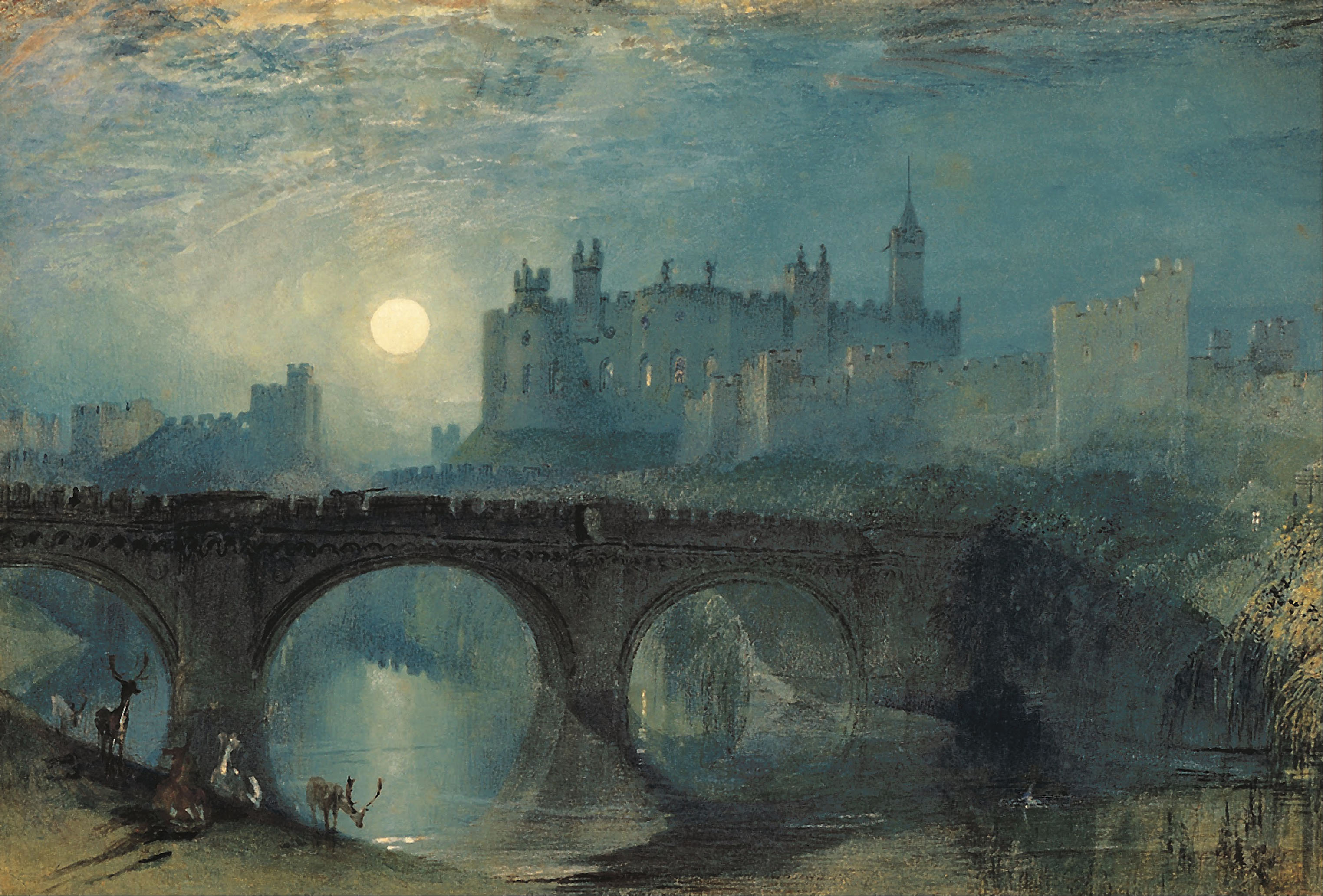 Following the sketch of 1797, it was more than thirty years before Turner returned to the subject to develop a watercolour [Art Gallery of South Australia, Adelaide] engraved in 1829 and published in 1830 for his series of ‘Picturesque Views of England and Wales’. It is perhaps one of the most extraordinary conceptions of the whole series, for Turner imagined the scene by night, with the full moon rising over the castle.