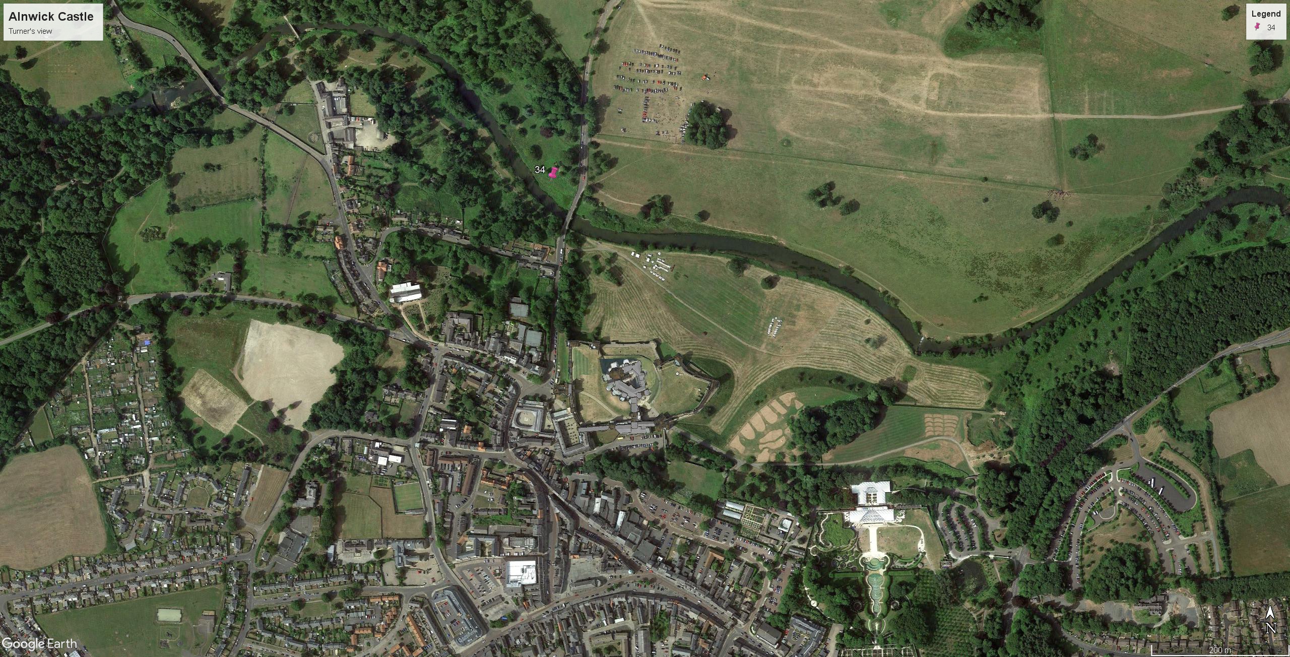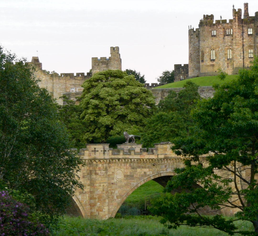 Tuner’s subject at Alnwick is the castle seen over the Lion Bridge from the NNW. Alnwick is one of the finest palace castles in the north, the seat of the Percy family, Dukes of Northumberland. It was started not long after the Norman conquests, and has been remodelled by successive generations to the present day. The bridge was built in 1775 by John Adam as part of extensive work on the castle and estate. It is famous for the stone lion on its parapet, emblem of the Percy family.