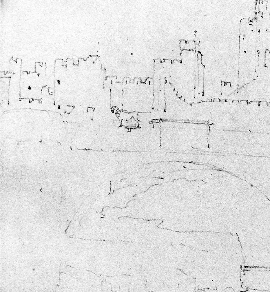 Comparison quickly reveals that the castle differs considerably in its details today, particularly in respect of the main block of the keep called the Prudhoe Tower towards the right. Although this appears to be medieval, it was built between 1854 and 1857, and Turner’s sketch accurately records the appearance of the castle before its mid nineteenth century remodelling. My photograph was taken in the mid-1990s when there were fewer trees, or at least they were very much smaller than they are today. Even so. I had to retreat further from the bridge than Turner in order to bring the castle into clear view. Today that is still more necessary, but it is entertaining to be able to judge from the old photograph exactly how much individual specimens have flourished in the interval.