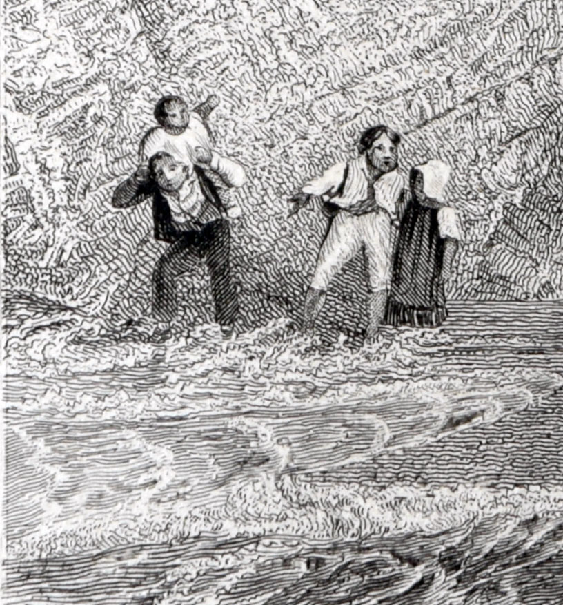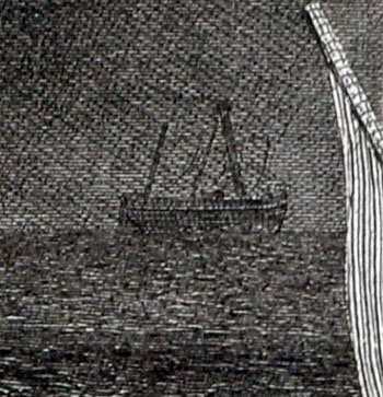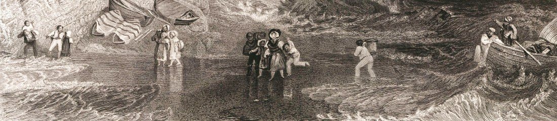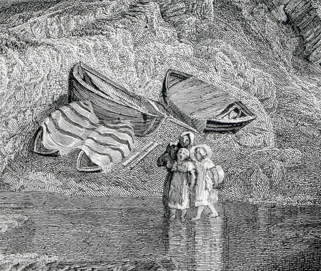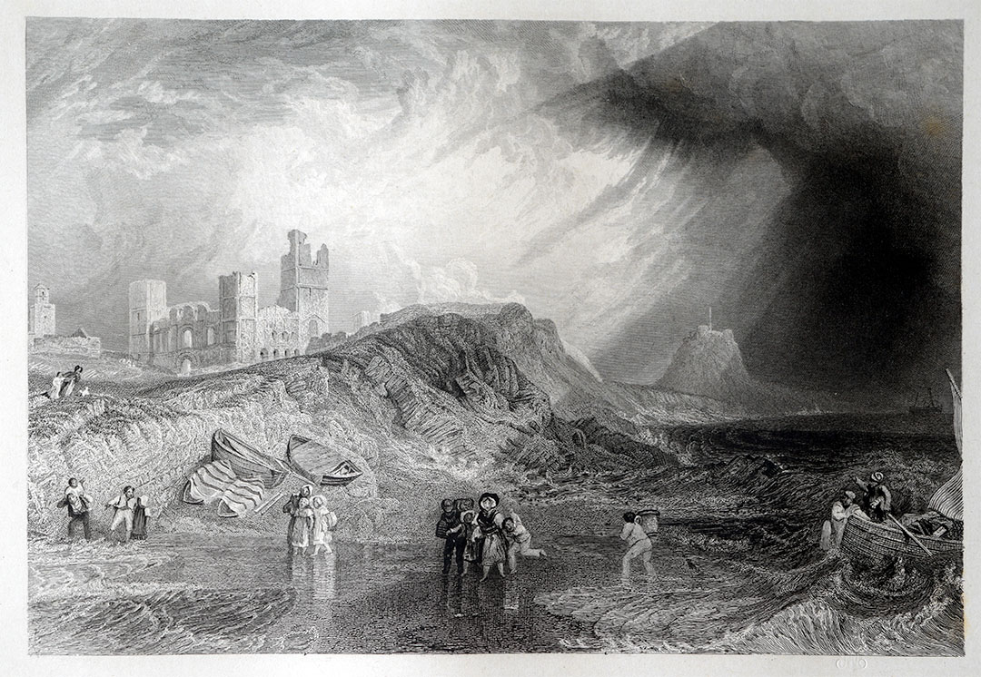 Turner’s engraved subjects are always worth examining closely for their figures. Turner’s sympathies were always drawn towards those whose lives exposed them most to the elements, and whose livings were dependent on their knowledge and understanding of nature. Here a small boat has pulled up in the surf to the right, and passengers are enjoying something of a foot-wetting on the shore whilst goods are offloaded.