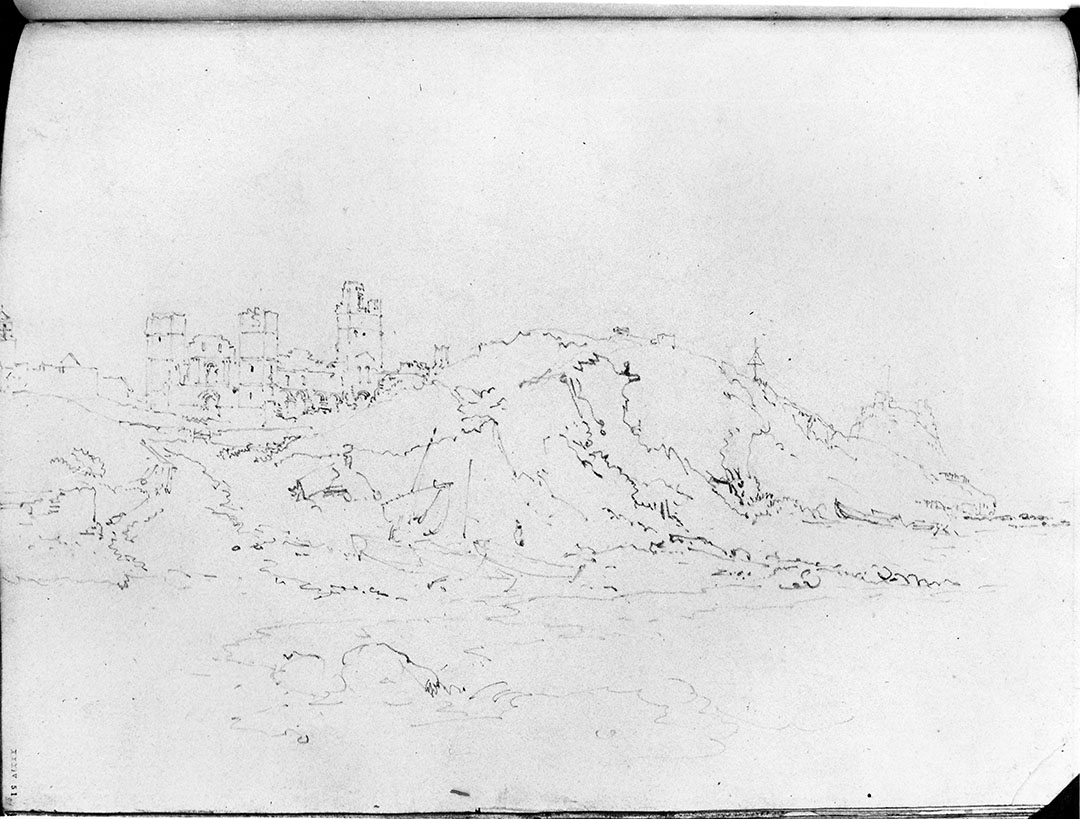 Turner’s only sketches on Holy Island date from his tour of the north of England in 1797. At the age of twenty-two, he was principally interested in developing his reputation for architectural subjects, and so devoted the majority of his time to five excellently detailed sketches of the interior of Lindisfarne Priory. His sketch of the present subject, however precedes those and must record his first impression, immediately on arrival.