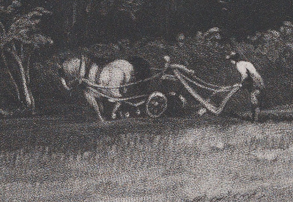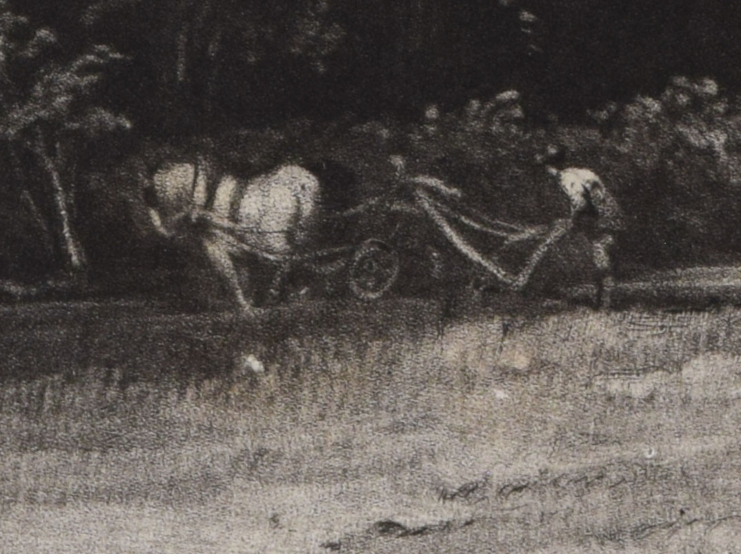 Here there are [at least] two artefacts that are unique to this impression. The first is a white mark on the ground below the horse, possibly caused by a fleck of paper on the plate, and the second is the lack of white highlight (the glint on the ploughshare) below the plough and a certain lack of detail to the plough wheels and traces in the same area. This appears to be the result of insufficient wiping of the plate in this area.