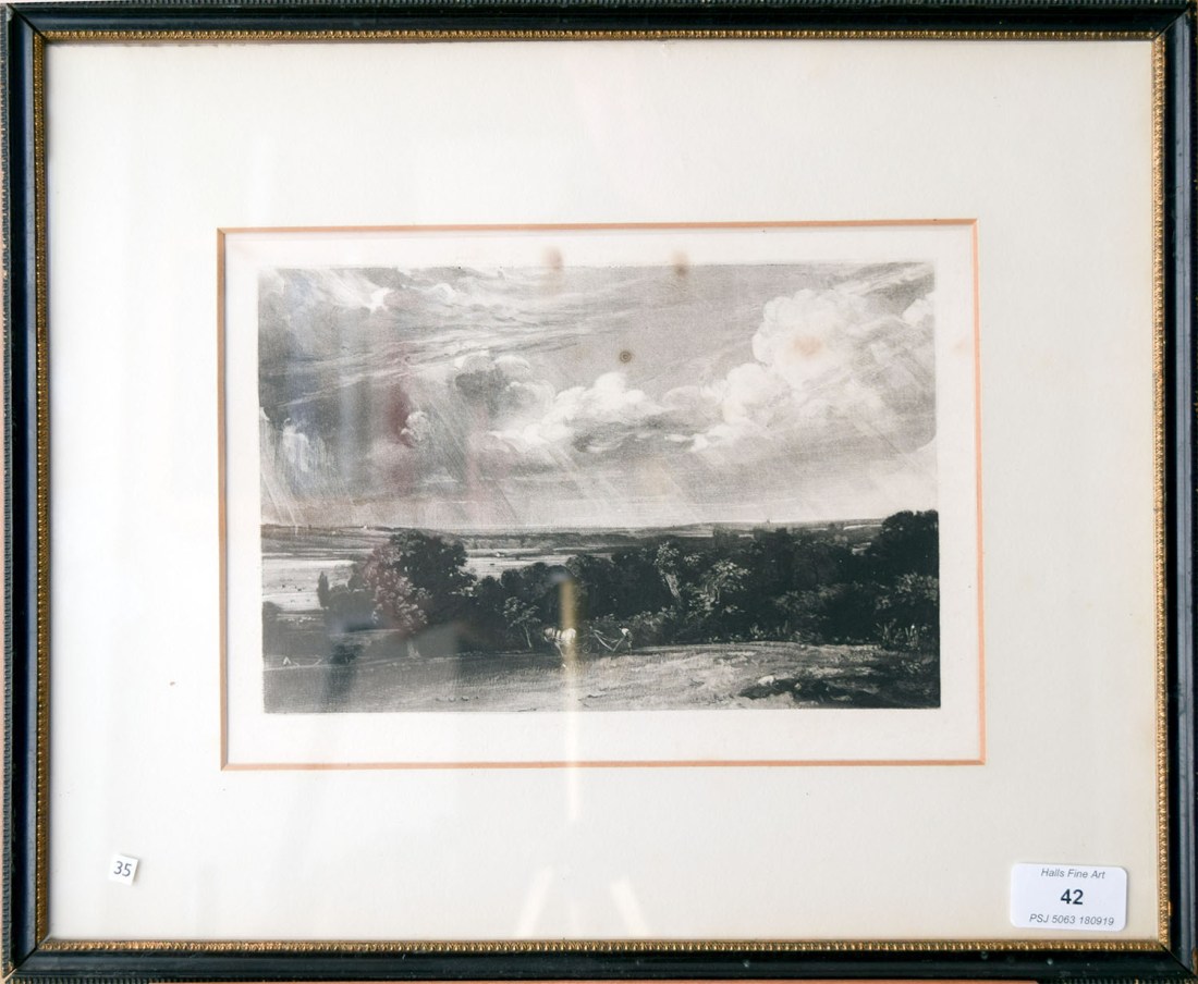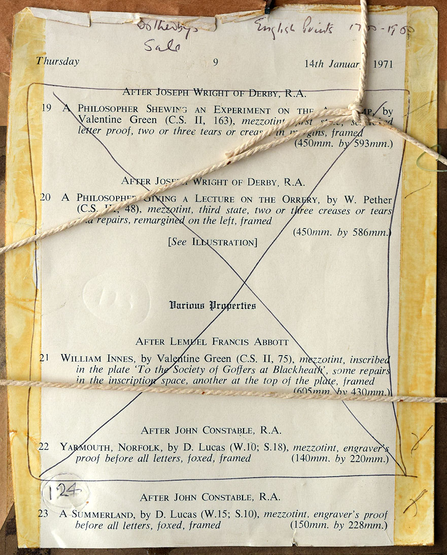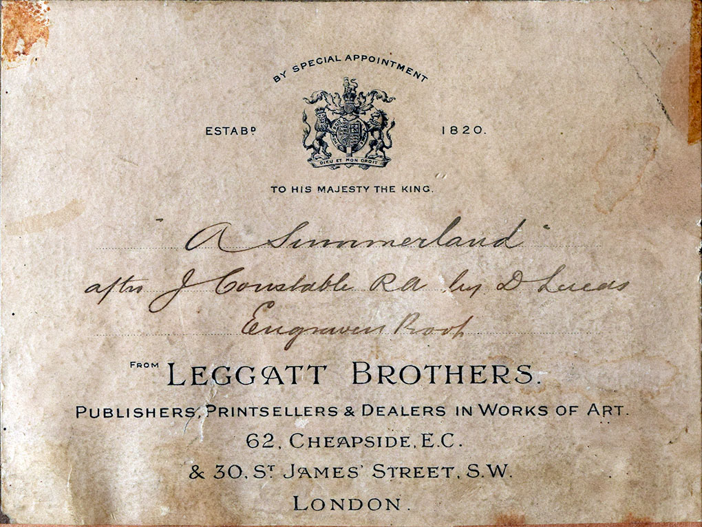 There are various labels and inscriptions on the backboard, including, on the original backing paper, the label of Leggatt Brothers, 62 Cheapside and 30 St James Street, London inscribed in ink ‘A Summerland/ after J Constable RA by D Lucas/ Engravers Proof’.