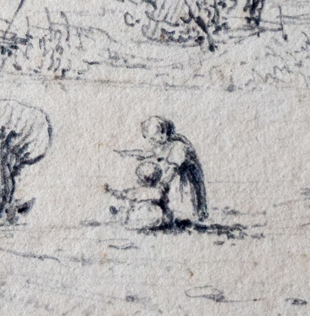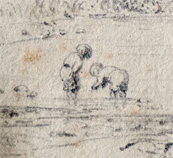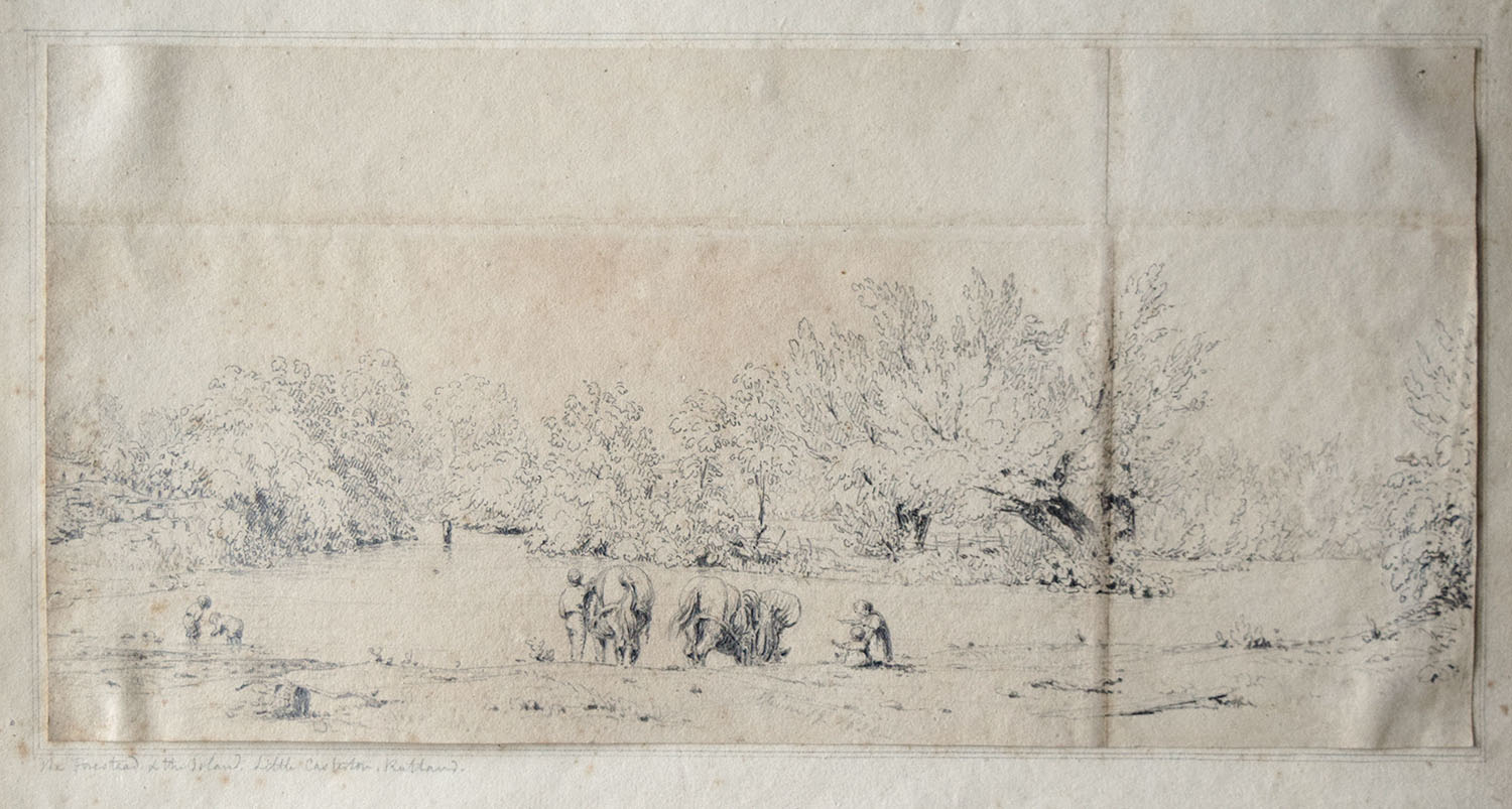 The present drawing is a painstaking and carefully-drawn panoramic landscape of the head of a loop in a slow-flowing river, with pollard willows and a variety of shrubs and small trees on the banks. The foreground is open to the water and the principal subject is of a pair of heavy horses being watered, being watched by two small girls seated on the bank close by, whilst a couple of young boys paddle in the water to the left, presumably catching sticklebacks. The figures and animals are very well caught and characterised, and a poetic of simple pastorality very professionally evoked. Drawn in the same decade as Constable’s ‘Hay Wain’, the aesthetics seem decidedly advanced and well-informed.