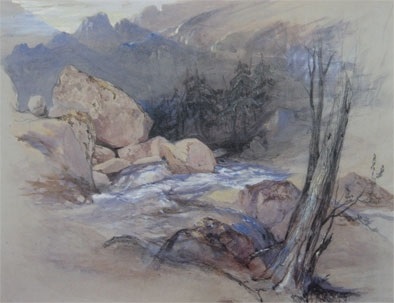 In the months before setting out for Chamonix in 1842 Ruskin enjoyed two artistic initiations. Firstly he saw the set of Swiss watercolours and ‘sample studies’ that Turner showed to prospective clients through his dealer Thomas Griffith. Ruskin recognised these as the culminating point of Turner’s knowledge of nature at its most sublime. He even persuaded his father to order two finished examples. He also took lessons in painting from James Duffield Harding. The latter was a very successful drawing master, known for a distinctive sketching style using toned paper and white highlights, but also known as an associate of Turner and capable of producing work of Turnerian effect and grandeur.