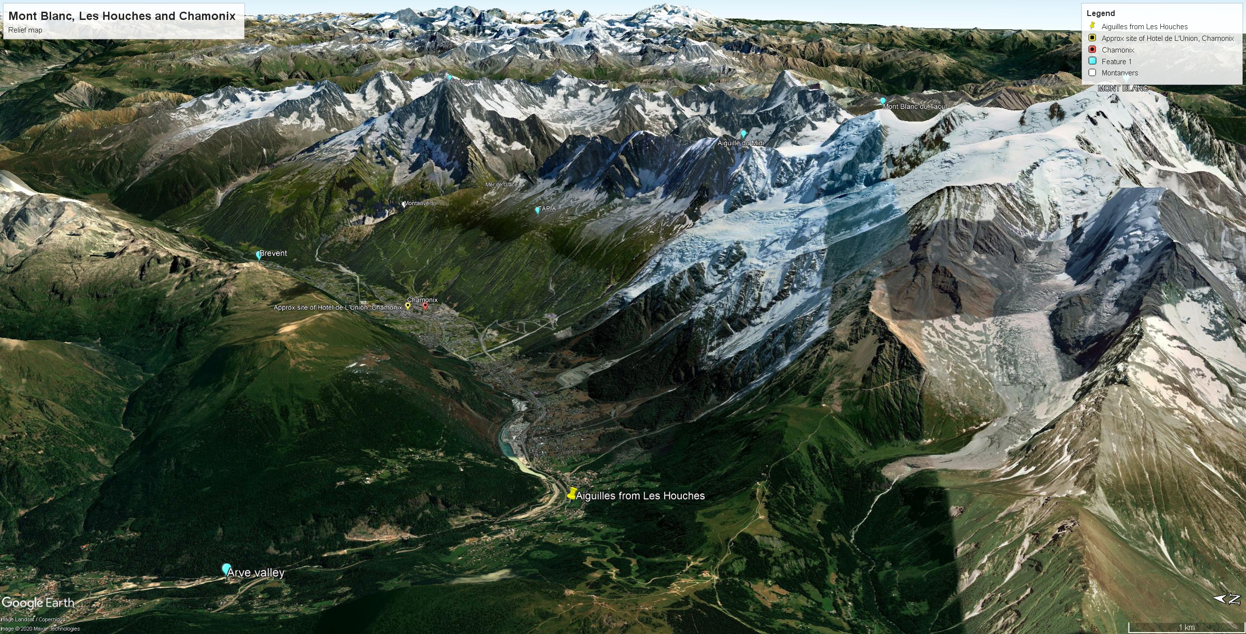 Ruskin’s viewpoint is a little way down the Arve valley from the village of Les Houches. We can see the river towards the left and the spire of Les Houches church to the right. The viewpoint provides one of the most comprehensive panoramas of the line of Aiguilles towering over the Chamonix valley. From left to right we see the Aiguilles Verte, Charmoz, Blaitiere, Plan, and Midi (above the church spire) culminating at the right with the peak of Mont Blanc de Tacul. The summit of Mont Blanc itself stands beyond the top right corner of the composition and the village of Chamonix is just hidden in the distance behind the bluff to the left.