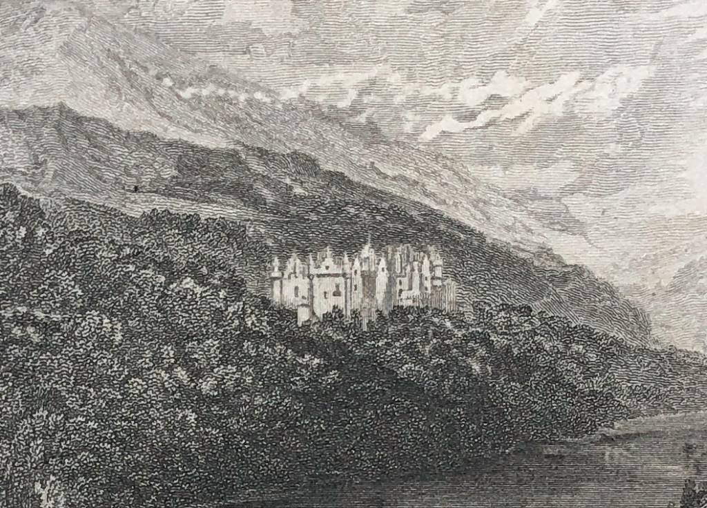 The watercolour was commissioned by Scott’s publisher, Robert Cadell of Edinburgh, and engraved by Henry Le Keux, 1834 as ‘Abbotsford’, the title-page vignette for Volume 12, ‘Dramas’, of Scott’s Poetical Works, 1832-34. It was the final volume of the set.