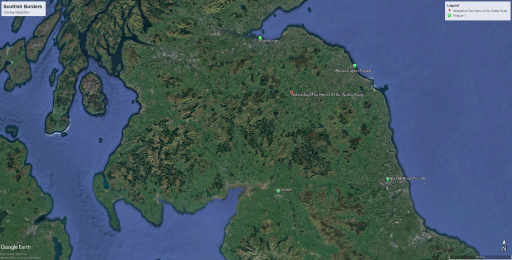 The subject is Abbotsford, the home of Sir Walter Scott. The house stands on the banks of the river Tweed in the heart of the Scottish borders about forty miles south of Edinburgh and forty west of Berwick upon Tweed.