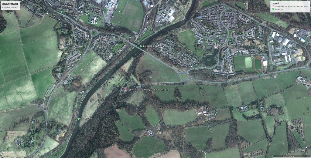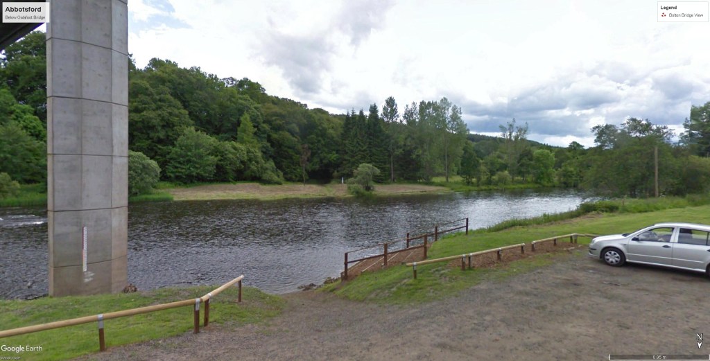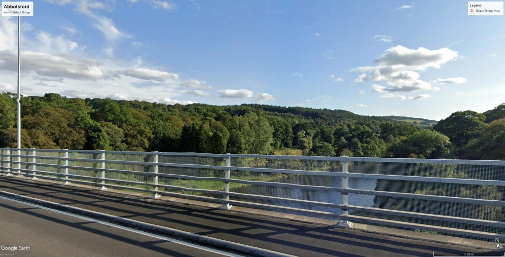 This was perhaps the steep scar below the modern township of Langlee, but if so any view from there today is obscured by trees and the modern Galafoot road bridge built in 1975 across the Tweed.