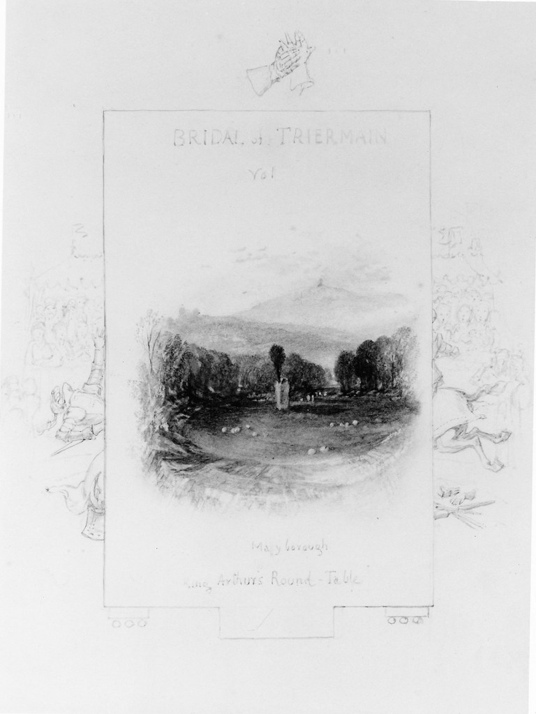 This is a small, highly-finished watercolour vignette showing a tree-circled clearing with, in the centre, a monolith with a tree apparently growing from it. In the distance left is the misty silhouette of a castle on a ridge, and in the right distance, an obelisk on top of a hill. The landscape is framed within a ruled cartouche, with flanking drawings of a fallen knight to the left and part of a similar figure on horseback to the right. Both incidents take place against a background of spectators under a canopy, apparently at a tournament or joust. Above is a crest formed of an armed glove grasping another, and the composition is lettered above, ‘BRIDAL of TRIERMAIN/ Vol’, and below, ‘Mayborough/ King Arthur’s Round Table’.