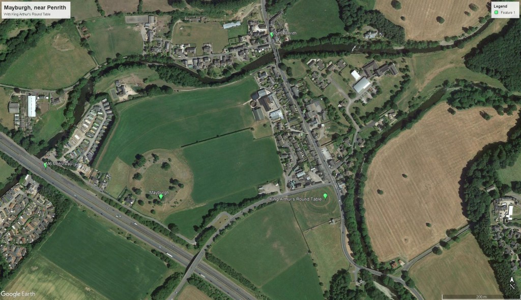 The subject is the still-impressive henge and standing-stone of Mayburgh, not far from the river Eamont, just over a mile south of Penrith in Cumbria. In the background is Penrith Castle and Beacon.