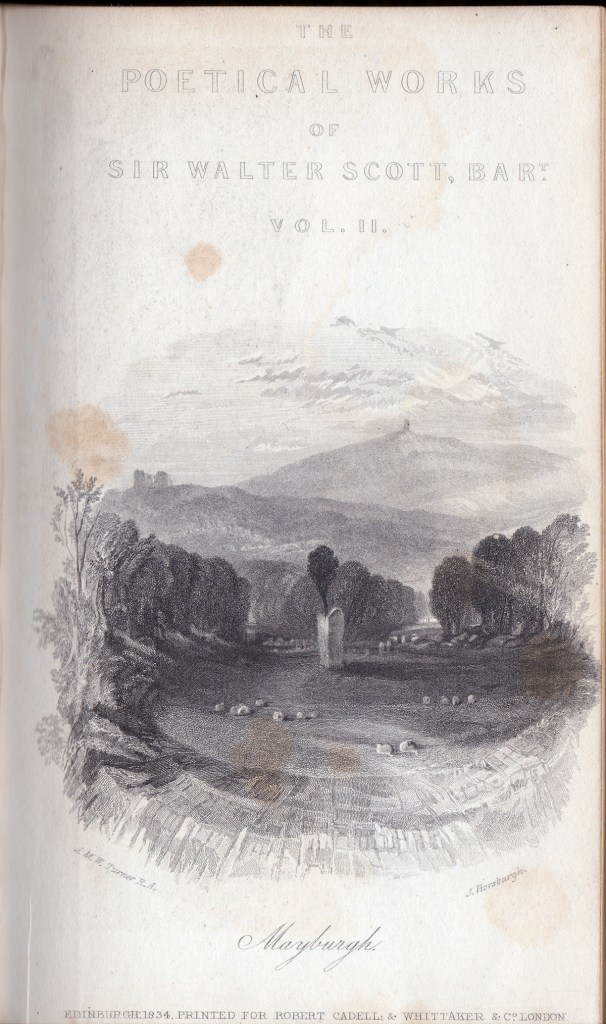 The subject of Mayburgh seems far from obvious as a choice of title vignette. Turner’s caption to his watercolour, however, conflates Mayburgh henge with the adjacent but separate structure dubbed ‘King Arthur’s Round Table’. Turner did also sketch that structure, though clearly found it less interesting than its neighbour. Scott does, however obliquely, lay the scene of the tournament there: