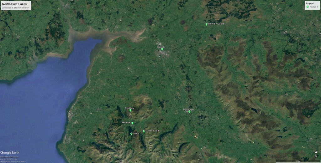 Instead the story tells of Gyneth an Illegitimate daughter of King Arthur. Once of age she goes to Arthur’s court at Carlisle to claim her birthright. Arthur’s knights vie for her hand, and a tournament and joust descends into bloody slaughter. Despite Arthur’s entreaties, Gyneth refuses to put an end to the carnage, and in desperation Merlin casts a spell on her that she may sleep in the Vale of St John until a knight finds and wakes her. Five centuries later along comes Sir Roland de Vaux of Triermain Castle, which is about ten miles north-east of Carlisle. Resting after battle with the Scots, he receives a vision of Gyneth and her enchanted castle and launches a quest to release her.