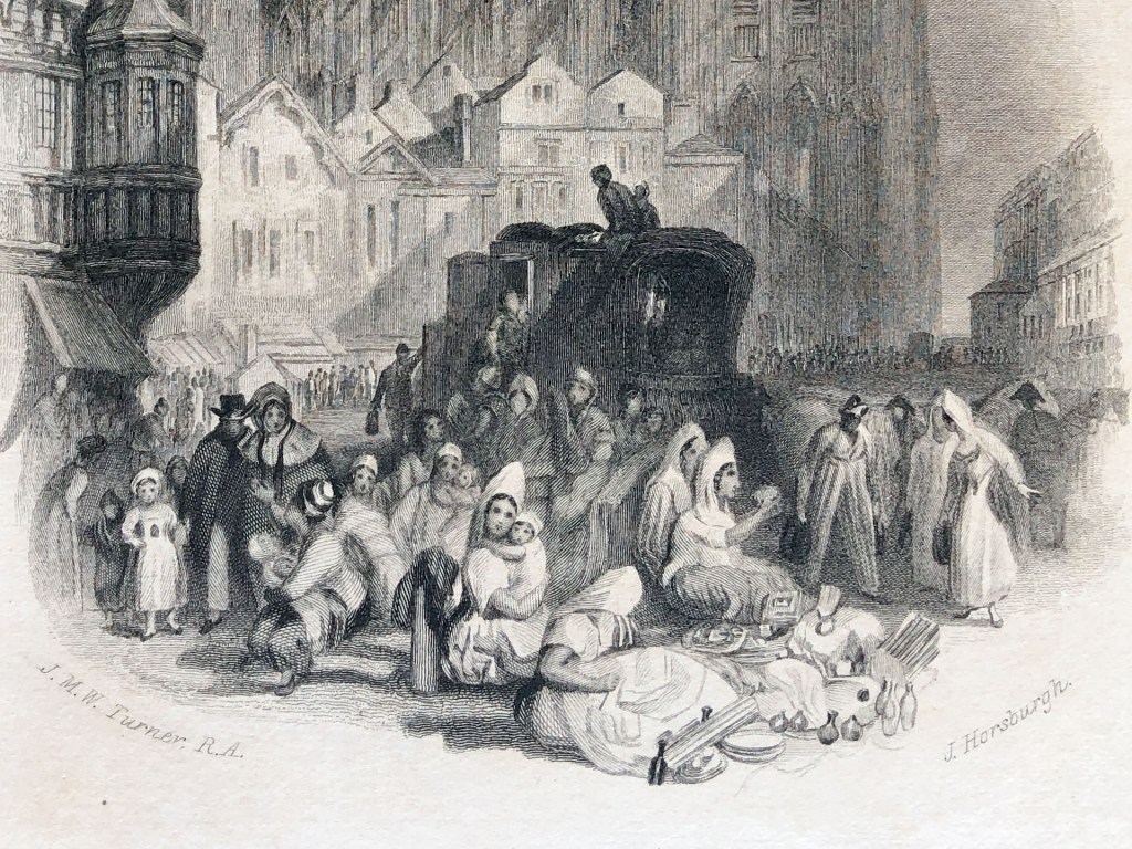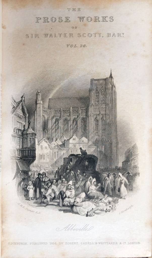 Armstrong 1902 p.238 – Abbeville. Circa 1834 [C W Lea, Esq. Of Worcester, ex Novar Collection. Chr. 1877, Munro] Vignette Market-place, with diligence and peasant women. The nave of church rises beyond, with rainbow over roof. Engraved by J Horsburgh, 1836, Scott’s “Tales of a Grandfather”.