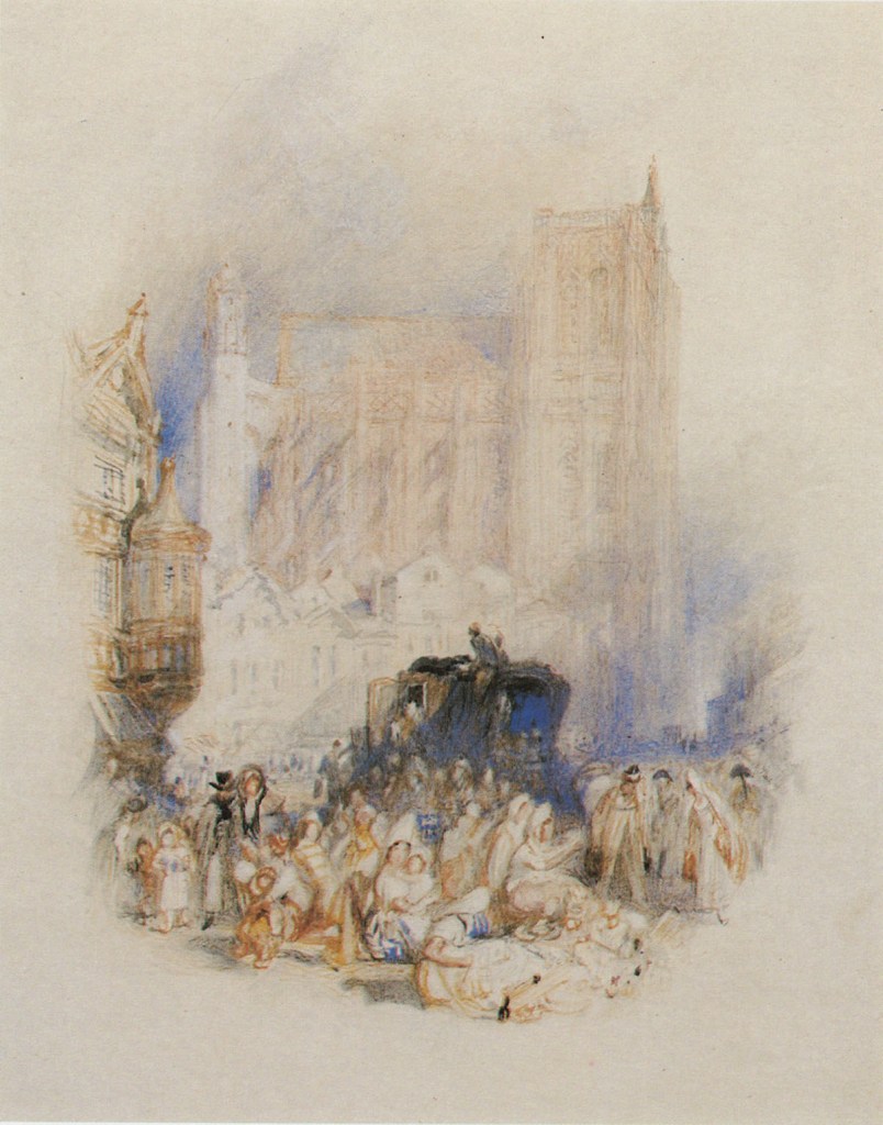 So what can have been Turner’s intention? By the time that he painted the present watercolour and its companion Turner had made several visits to France. It is perhaps significant that sketches for both of these subjects were made on the same tour of 1824. By then the traumas of the Battle of Waterloo and the end of the Napoleonic Wars in 1816 were sufficiently distanced for British visitors to France to have become numerous and mostly welcome. When Turner toured there in 1824 it would have seemed as if Europe offered a new world of expanded horizons in a variety of peacetime contexts; historical, cultural, social and commercial. Turner’s lifelong project was to operate within the imaginative dreamwork of changing times and relations.