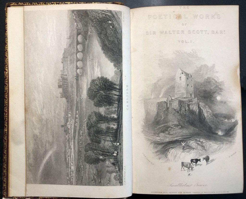 In 1831-32 Turner made a series of twenty-four watercolours for the Edinburgh publisher Robert Cadell. These were to serve as frontispieces and title-page vignettes for a new twelve-volume edition of the poetry of Sir Walter Scott. This was designed to continue and be uniform with, the 12mo popular edition of Scott’s complete works that Cadell had begun publishing with the novels in 1828. These had frontispieces and engraved title-pages by a variety of popular artists of the day, but none by Turner. For the poetry Cadell persuaded Scott that Turner should be the sole illustrator and the artist was invited to visit Scott at his Abbotsford home to visit sites together in the neighbourhood.