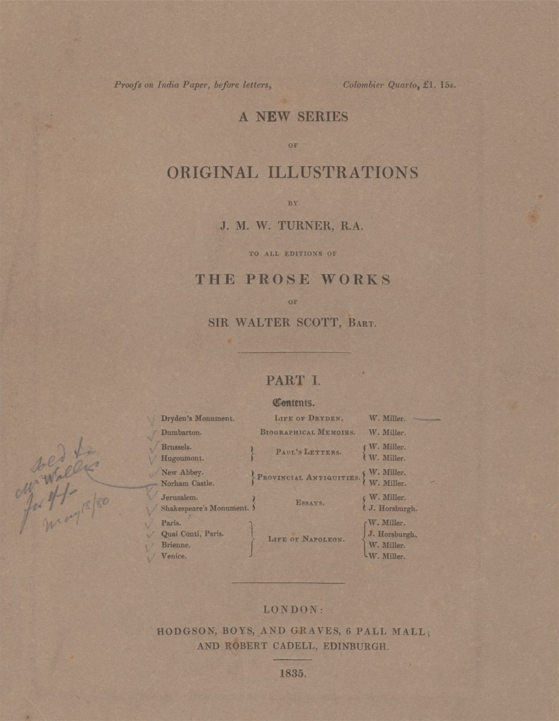 Part one appeared in 1835, published by Hodgson, Boys and Graves, 6 Pall Mall, and Robert Cadell, Edinburgh and consisted of the twelve Turner plates issued up to the first volumes of the ‘Life of Napoleon’.