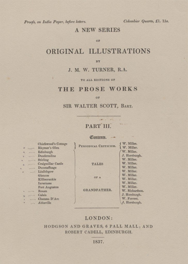 In 1833 and 1834 Turner made a series of forty watercolours for the Edinburgh publisher Robert Cadell, to serve as frontispieces and title-page vignettes for a twenty-eight volume series of Scott’s Miscellaneous prose. This was designed to be complete and be uniform with, the 12mo popular edition of Scott’s complete works that Cadell had begun publishing in 1828 with the novels. These had frontispieces and engraved title-pages by a variety of popular artists of the day, but none by Turner. The novels were followed in 1833-4 by ‘The Poetical Works of Sir Walter Scott’ in 12 volumes, exclusively illustrated with twenty-four subjects by Turner’. Cadell commissioned the illustrations for the ‘Prose Works’ whilst the poetry was still in production, and the first volume immediately followed the last of the poetry in 1834 and continued with monthly volumes until 1836.