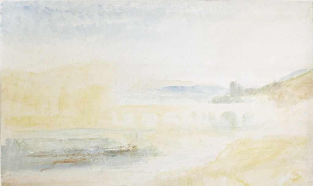 This is a good-sized watercolour study of a light-suffused river valley landscape. A long, many-arched bridge stretches across the composition in the mid-distance whilst a shallow river flows away in the lower right corner. Blue hills close the distance.