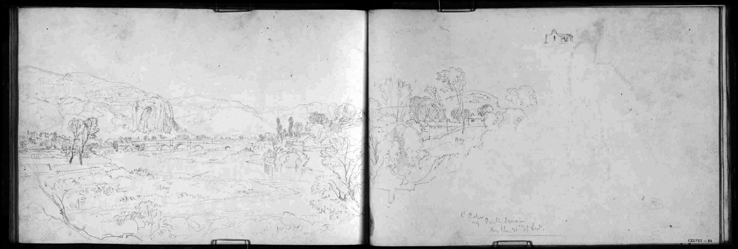 It seems possible that he did find an alternative outlet for a finished version of this subject, for the sketch is inscribed ‘C Cope | 29 Park Square | by the 31st of Decr’. A similar inscription on another page of the same sketchbook (Turner Bequest CXLVIII 25; D11564;) adds the date 1825. Charles Cope was a Leeds-based artist and engraver, and it may be that he thought to engrave the subject himself. It seems possible that the Tate colour-beginning is a few years earlier than the present example and made with the ‘History of Richmondshire’ composition in mind, but the present study was made anew for the Cope commission. The Turner Bequest example is cooler in colour, and less ethereal in handling. It is not impossible that a finished watercolour did materialise, but none such has ever been recorded.