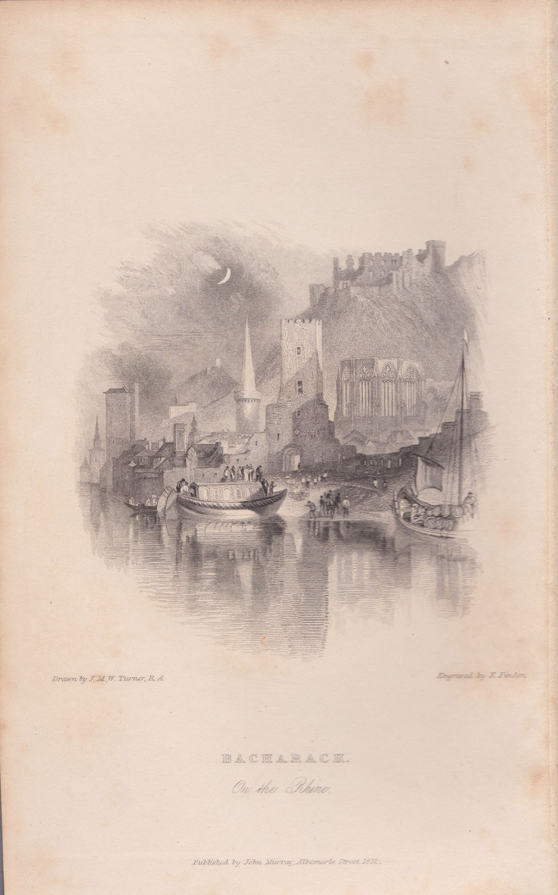 The watercolour is one of seventeen vignettes made for engraving in John Murray’s edition of the ‘Life and Works of Lord Byron’. This plate was engraved by Edward Finden, dated 1832 and was issued as the frontispiece to volume 8 with the engraved title of ‘Bacharach on the Rhine’.