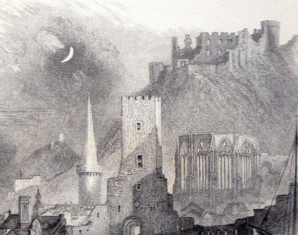 This is a small, highly-finished watercolour vignette of boats moored by a town bristling with spires and towers. In the centre is a tower gateway fronting onto the shore, with to the left a church spire, and at the left edge a tall waterside tower. To the right is a large gothic octagonal chapel with large windows, and above, on the top of a steep hill the ruins of a once-considerable castle. Sunlight streams in from the right and a crescent moon hangs in the sky above a tower on a distant hill.