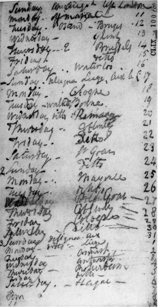 He left London on Sunday 10 August and took a ferry to Ostend. From there he travelled via Bruges and Ghent to Brussels, from where he visited the field of Waterloo. From there he headed for Cologne, and then made a tour of the Rhine as far as Mainz. He spent a week travelling down to Mainz, and then three days returning to Cologne, before heading home via Aachen and Antwerp to Rotterdam and The Hague, returning to England, presumably, from Rotterdam.