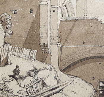 Cotman made several dozen drawings for the ‘Excursions through Norfolk’ project. They are painted in a uniform palette of subtle sepias and greys, and are some of the most sparing and economically beautiful drawings of Cotman’s career. In many ways they represent the aesthetic peak of his early career, so it is somewhat disappointing that the engravings are uniformly small and generally careless and on the whole are a travesty of the subtlety that Cotman invested in the originals.