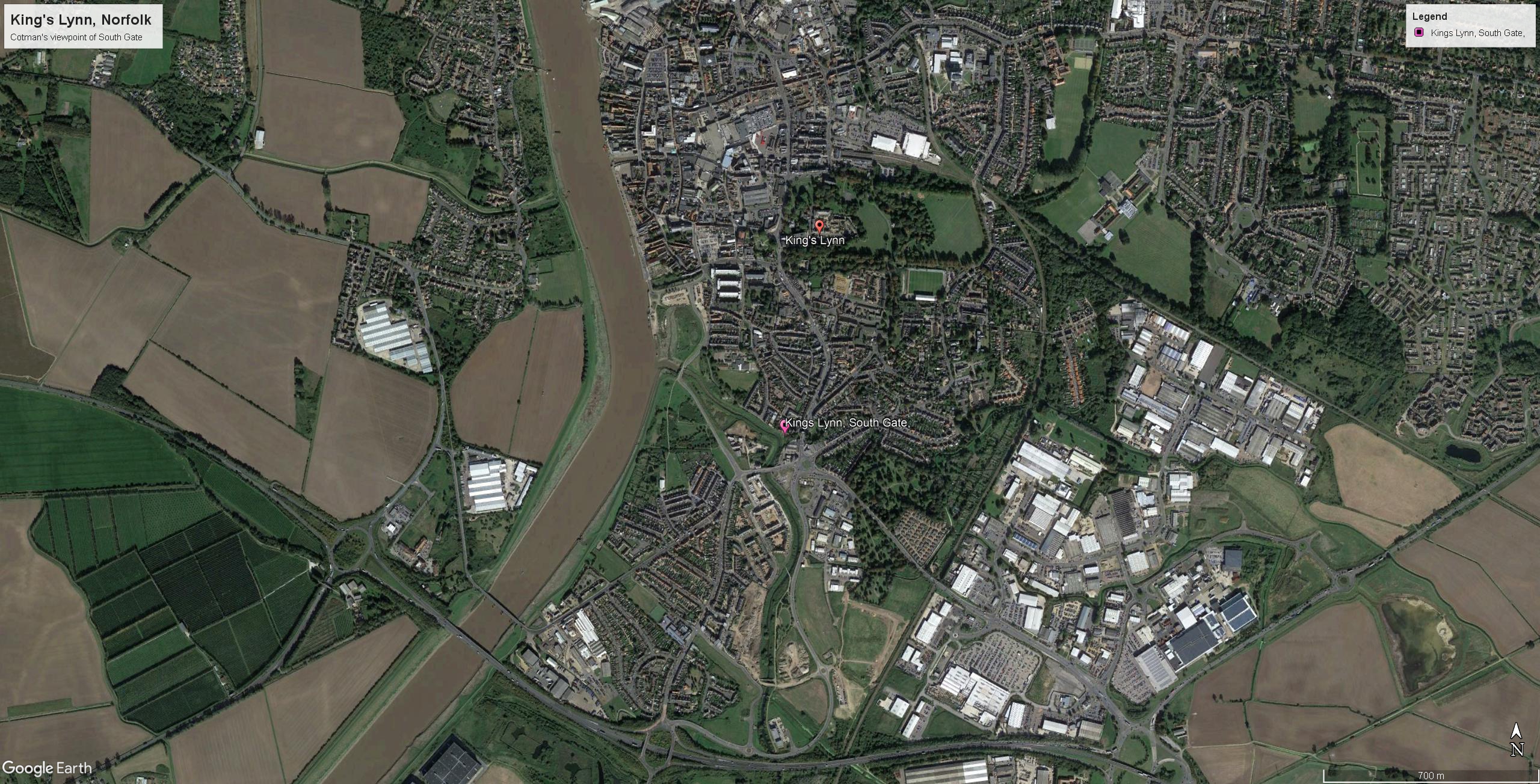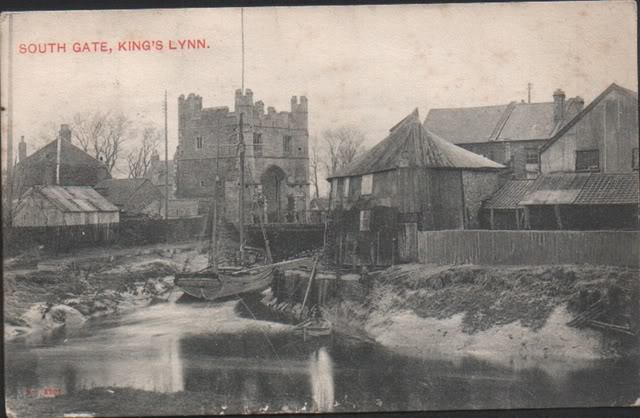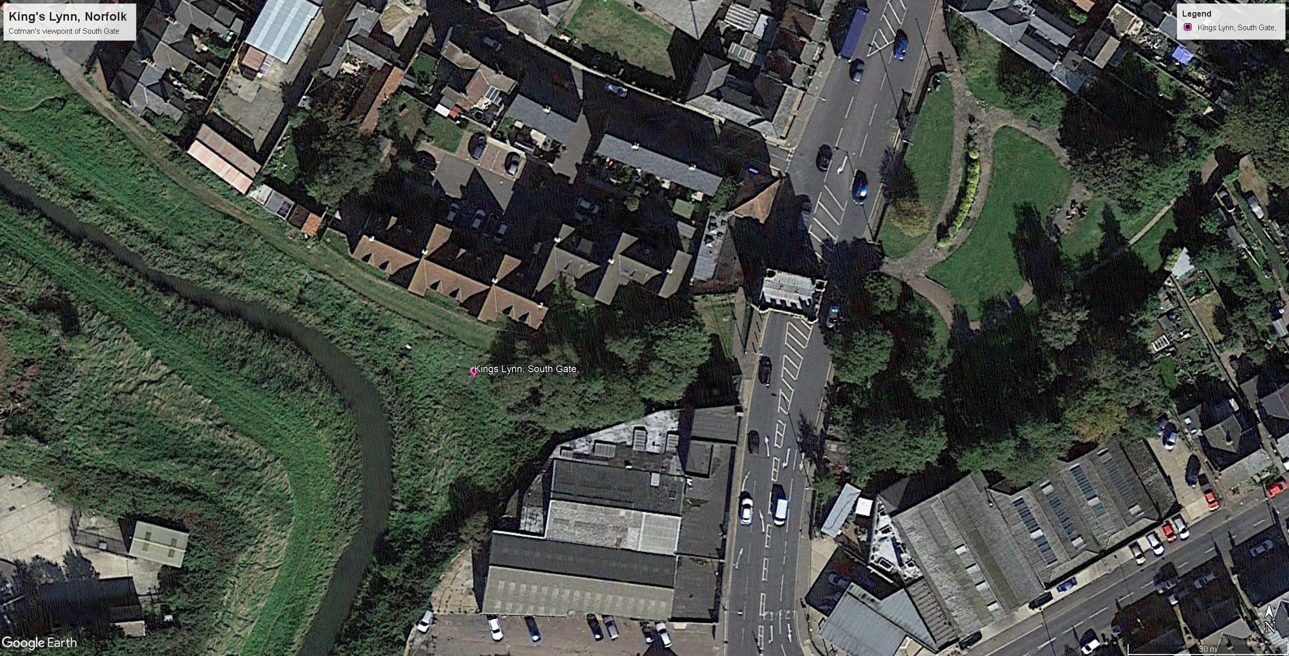 The subject is the west side of the South Gate at King’s Lynn. The gate survives largely intact but the high wall on the bridge has been removed. The viewpoint is from the west, and the sun is shining from almost due south. I have not yet managed to take my own comparative photograph, and from the Google Earth image it looks as if there is a large tree grown up in the way. Still, there are some fascinating comparative images on the splendid guide site to King’s Lynn, ‘The Walks.uk’ and a superb old postcard of pretty much exactly the same view on King’s Lynn forums