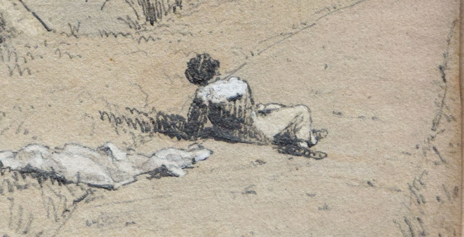 This is a painstakingly-drawn landscape of a boy or young man half-sitting and half-lying on a path in the right foreground. The ground must be warm for he has no need of the cloak lying nearby. He is possibly drawing.