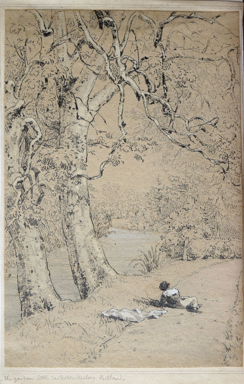 Pencil and grey wash with white bodycolour on medium-weight, buff, handmade, Whatman-type, rag, wove paper, 255 x 170 mm, mounted on a larger sheet of similar weight and type of paper, slightly lighter in tone, cut down irregularly to 276 x 180 mm with two pencil keylines [partly trimmed away] and inscribed, lower left, with title [partly trimmed at left ‘[In] the garden, Little Casterton Rectory, Rutland’